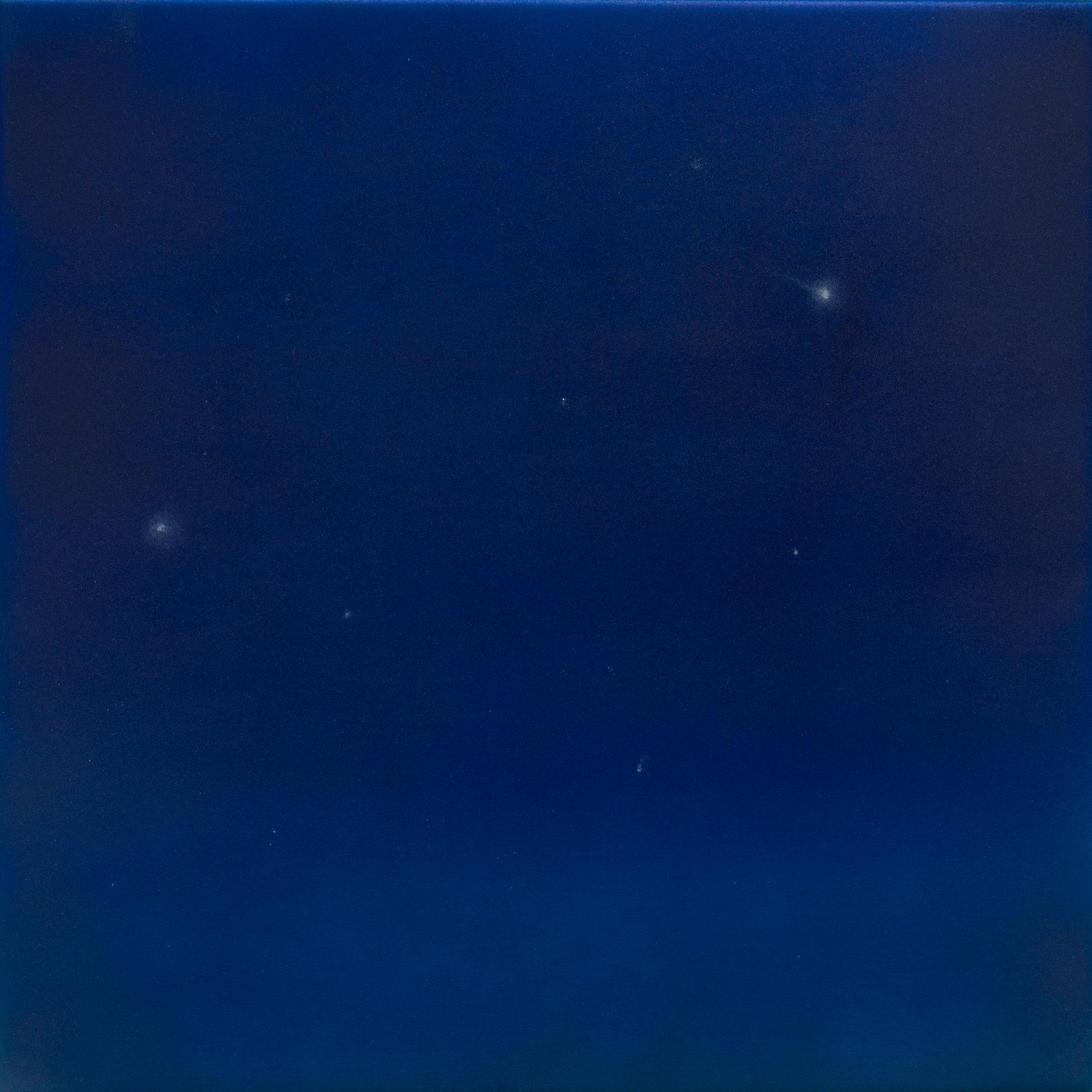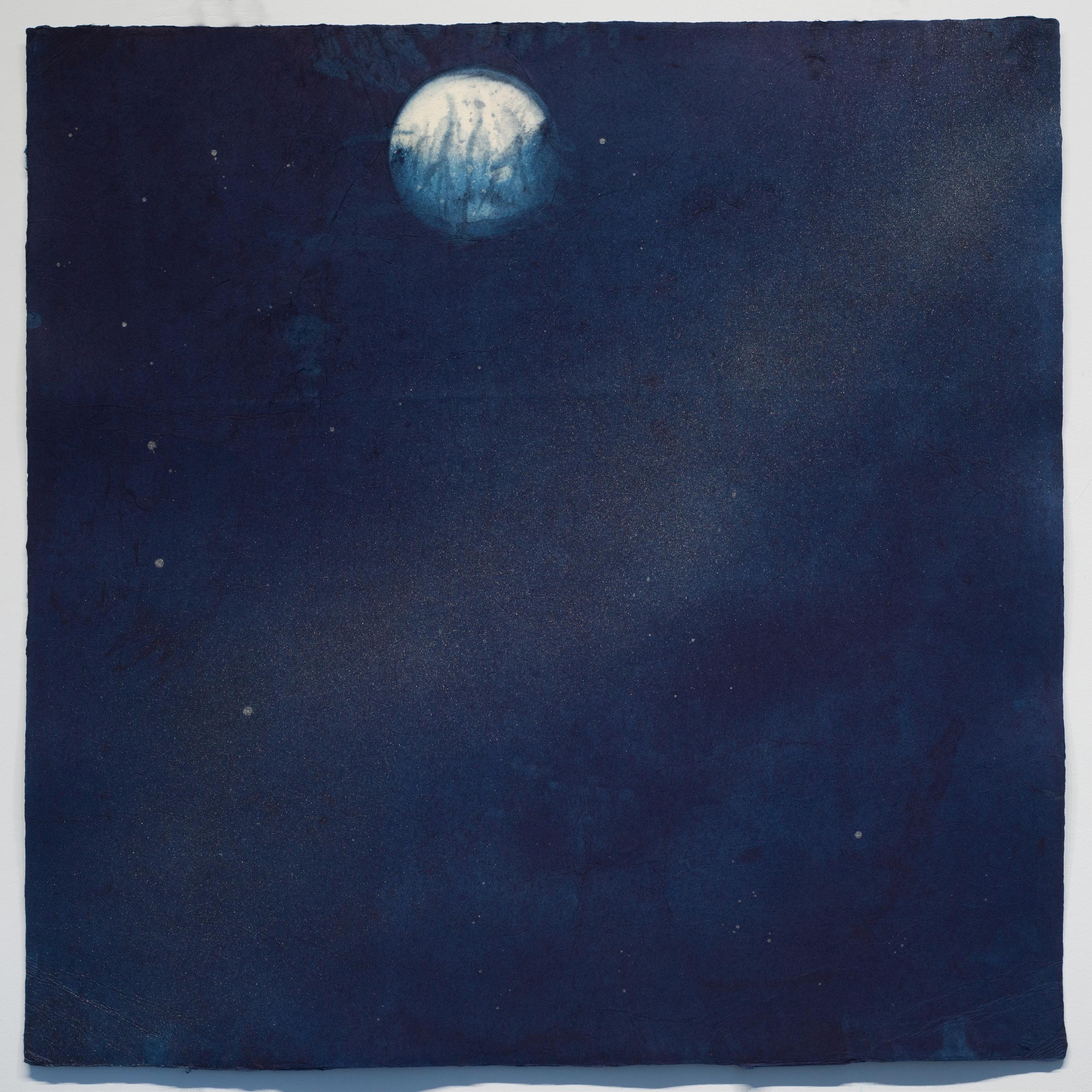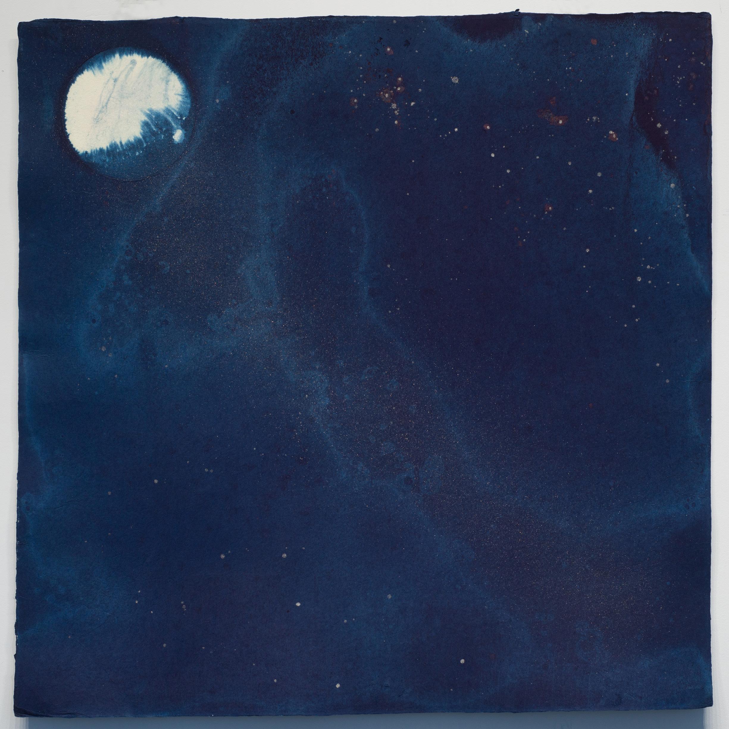 Paying homage to the Japanese tradition of paper making, Ando created corresponding works using indigo on Japanese Kozo paper, which is derived from the Mulberry plant. In these pieces, the moon occupies only a small portion of the composition. Ando applies the indigo in varying degrees of intensity across the paper, creating a sense of depth and space. She adds pure silver dust to evoke the shimmering Milky Way, referred to in Japanese as Ginga, the silver river in heaven. “During the lockdown I sought solace in creating works that felt like windows I could disappear into,” she says. “It comforts me to look at paintings that feel endless and vast, where, in my mind, I can float away to celestial spaces of quietude.”