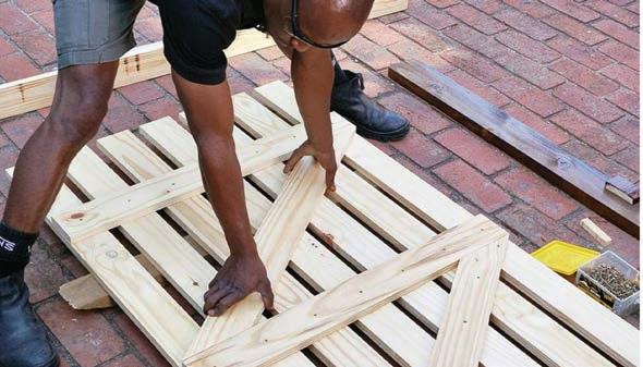 Diagonal braces between the three cross-pieces will give the gate far more rigidity and strength. The trick is to cut the ends at the correct angle to be flush with the cross-pieces. Line up the diagonal brace between the top cross-piece and the middle one. Draw a line at the angles needed to fit snugly against the cross-pieces and cut. Secure it in place with glue and 4mm x 30mm screws. Repeat the process for the second diagonal brace on the bottom half of the gate.