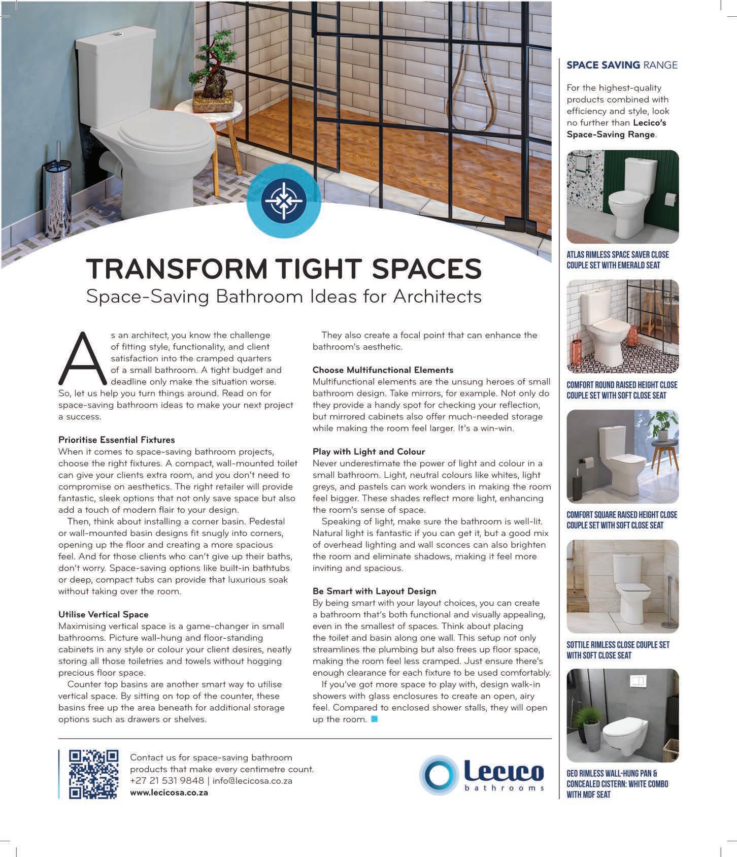 A guide to space-saving bathroom ideas for architects when designing for small bathrooms. By Lecico