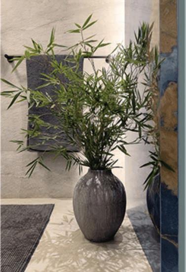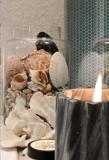 Mncube created the perfect, eco-chic “rocks, sand and sea” combination. On the bold colour front, she proposed Micro Teal Enviro-Glass Mosaics (310 x 312), locally manufactured from 100% recycled glass, to elevate the vanity and shower walls. Then she suggested the neutral “anchor” of Klif Silver (750 x 1 500), a magnificently varianced stone-look porcelain tile by Italian tilemakers Atlas Concorde. Both the mosaics and the stone-look porcelain tiles are exclusive to Italtile and carry Italtile’s LiveGreen label.