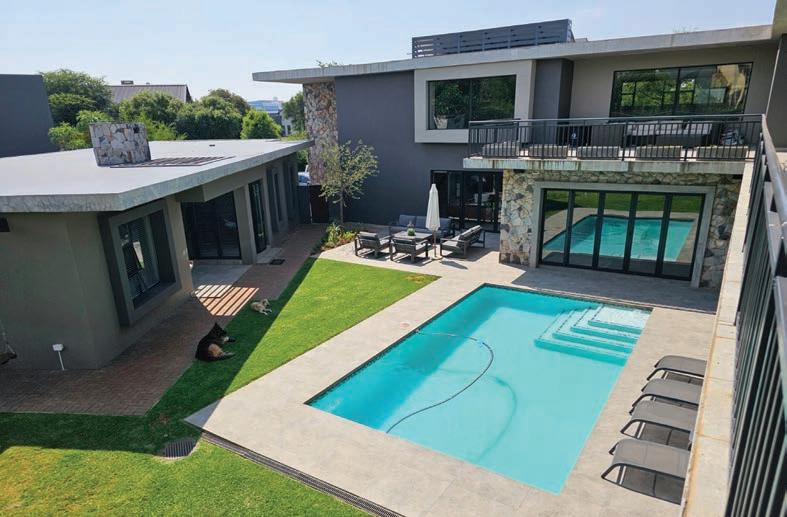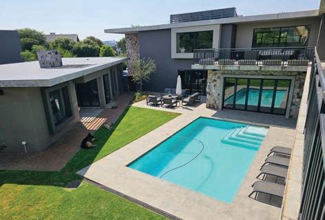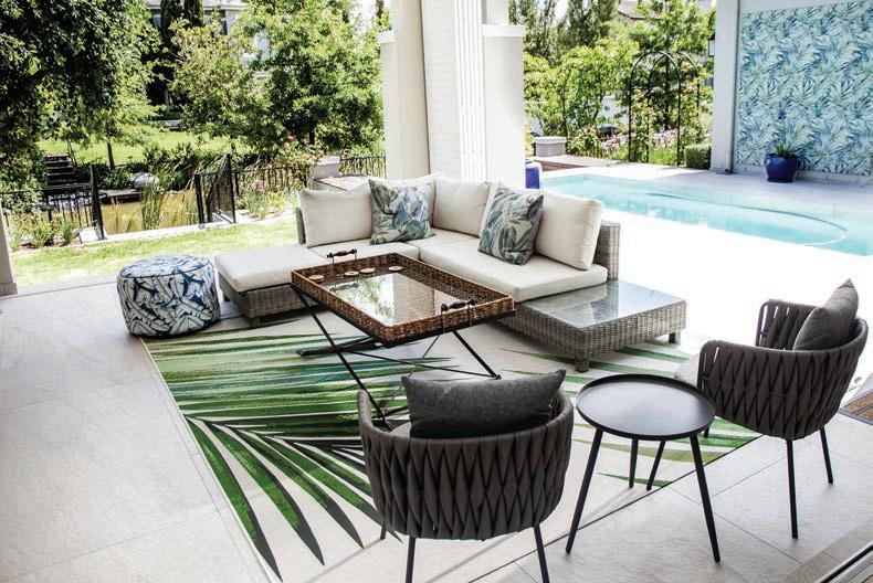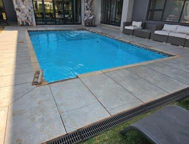 custom-built homes, to create an impeccably envisioned, one-of-a-kind outdoor living area that speaks of the lively, active Robinson family’s personality, underpinned with a sense of timeless luxury and eternal summer. Jordaan proposed a layering of sustainable, biophilic porcelain tiles to honour the home’s proximity to nature, using Italtile’s exclusive, Klif Silver by Italian tile masters Atlas Concorde as the “base canvas”. Klif is a full-bodied porcelain tile that reimagines a living stone look with deep detail and fascinating variances. Jordaan had oversight of the precision mitred edging around the pool. Mitred edges create a superb finish (incorporating two 45-degree angles that deliver a 90-degree angle when installed). Here, the end result is a seamless illusion of a horizontal tiled surface that appears to “spill over” onto the vertical surface and into the pool.