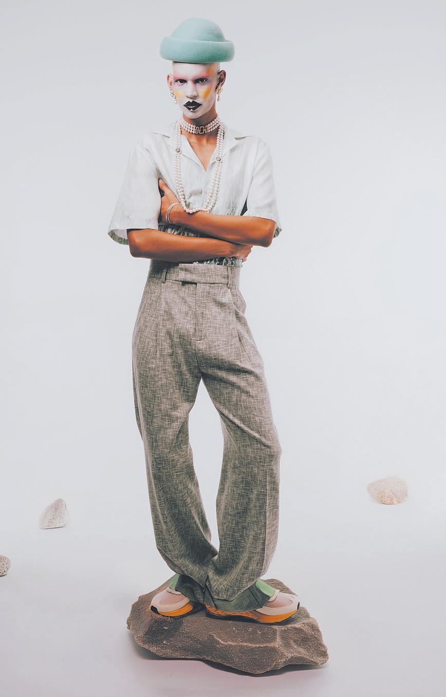 Seven years later and Pailman’s otherworldly looks and passion for embodying a designer’s narrative have seen him model for brands such as Viviers Studio, Wanda Lephoto, Thebe Magugu and A Better Mistake, as well as Hunger Magazine. In every image, whether standing broad-shouldered in a suit or posing sultrily in false lashes and a wickedly sharp eyeliner, Pailman radiates confidence. His favourite work, however, is not the conventional. “The crazier the better,” he says with a laugh. “Especially this shoot felt like the representation of my soul rather than the outside of me. In a shoot, when someone has the craziest ideas [of what] to put me in, I am like, ‘Yes,’ because I feel like my soul is the most colourful part of me.”
