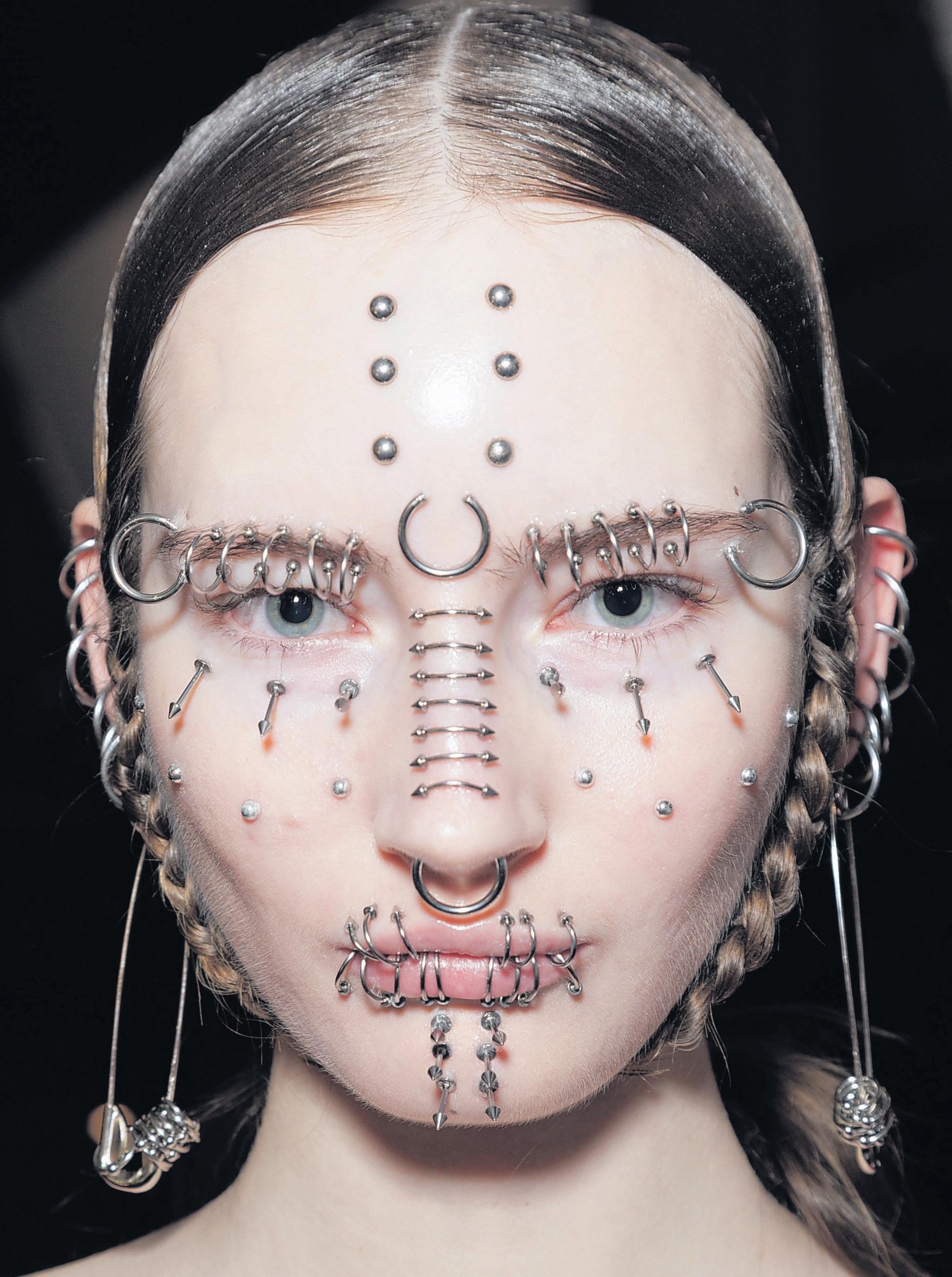 one are the days when the runways showed only one beauty standard. As inclusivity becomes more important, so does the representation of all types of beauty. With the influence of Gen Z continuing to govern social-media trends, we now live in an era that’s tired of the perfect “Victoria’s Secret model” kind of beauty. Instead, people want a more realistic look, as seen in TikTok trends such as faux freckles, dark-circle makeup and crying-girl makeup. With celebrities such as Julia Fox and Doja Cat constantly challenging the beauty standard with shaven heads, bleached eyebrows, hairy body parts and subversive makeup choices, one could say that we have entered an era of “anti-beauty”. The trend is not just about “looking ugly-beautiful”: at its core, it pushes for the celebration of self-expression, real beauty and man-repellent makeup, reclaiming the power to look however you want and not be governed by the male gaze. On the runways, amid a sea of fresh-faced, angelic beauties, there has been an exciting rise in anti-beauty looks that incorporate faux piercings, face tattoos and makeup applied in a way that unsettles the eye with its imperfect, colour-outsidethe-lines, smudged-up messiness.