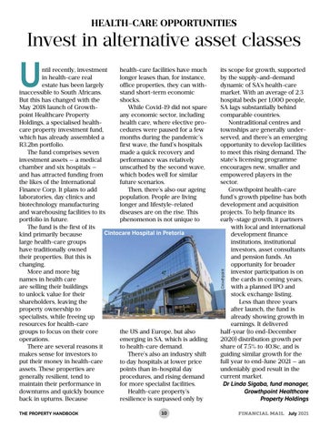 health-care facilities have much ntil recently, investment longer leases than, for instance, in health-care real office properties, they can withestate has been largely stand short-term economic inaccessible to South Africans. shocks. But this has changed with the While Covid-19 did not spare May 2018 launch of Growthany economic sector, including point Healthcare Property health care, where elective proHoldings, a specialised healthcedures were paused for a few care property investment fund, months during the pandemic’s which has already assembled a first wave, the fund’s hospitals R3.2bn portfolio. made a quick recovery and The fund comprises seven performance was relatively investment assets — a medical unscathed by the second wave, chamber and six hospitals — which bodes well for similar and has attracted funding from future scenarios. the likes of the International Then, there’s also our ageing Finance Corp. It plans to add population. People are living laboratories, day clinics and longer and lifestyle-related biotechnology manufacturing diseases are on the rise. This and warehousing facilities to its phenomenon is not unique to portfolio in future. The fund is the first of its Cintocare Hospital in Pretoria kind primarily because large health-care groups have traditionally owned their properties. But this is changing. More and more big names in health care are selling their buildings to unlock value for their shareholders, leaving the property ownership to specialists, while freeing up resources for health-care groups to focus on their core the US and Europe, but also operations. emerging in SA, which is adding There are several reasons it to health-care demand. makes sense for investors to There’s also an industry shift put their money in health-care to day hospitals at lower price assets. These properties are points than in-hospital day generally resilient, tend to procedures, and rising demand maintain their performance in for more specialist facilities. downturns and quickly bounce Health-care property’s back in upturns. Because resilience is surpassed only by