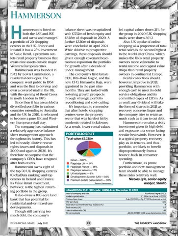 Rita-Rose Gagné (CEO) £1.68bn (as at June 18 2021) 0.4p (FY2020), 4.0p (FY2019 enhanced scrip) 82p -4 5.7 40 +44 (0) 20 7887 1000; www.hammerson.com