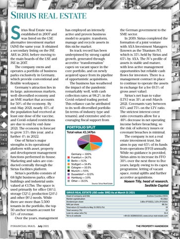 irius Real Estate was established in 2007 and was listed on the LSE alternative investment market (AIM) the same year. It obtained a secondary listing on the JSE AltX in 2014, before moving to the main boards of the LSE and JSE in 2017. The company owns and operates a portfolio of business parks exclusively in Germany, which provide conventional and flexible workspace. Germany’s attraction lies in its large, autonomous markets, well-diversified economy and an SME market that accounts for 50% of the economy. By end-May 2021, nearly 45% of the population had received at least one dose of the vaccine, and Covid-related restrictions are due to end by end-June 2021. The economy is forecast to grow 3.5% this year, and a further 4% in 2022. One of Sirius’s major strengths is its operational platform with asset, property and development management functions performed in-house. Marketing and sales are conducted centrally through the Sirius Facilities platform. Sirius’s portfolio consists of 68 light business parks, office buildings and industrial units valued at €1.7bn. The space is used primarily for office (36%), storage (32%), production (24%) and other (8%) needs. While there are more than 5,500 tenants in the portfolio, the top 50 anchor tenants account for 53% of revenue. Over the years, management FINANCIAL MAIL July 2021
