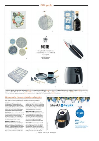 Homemade, the very best brand of gifts F i ve i d e a s t h at w o n’ t b r e a k t h e b a n k , b u t w i l l i m p r e s s t h e r e c i p i e n t s CHEESY Put together a small hamper containing a jar of green preserved figs, a wedge of cheese (vacuum packed is best), some nuts, dried fruit or a jar of chutney. Add a packet of oat biscuits or any savoury biscuit. Pack onto a wooden board, wrap in cellophane and tie up with string or raffia. SWEETIE PIE Take a glass jar with a lid and half fill with caramelised condensed milk. Top this with an equal amount of chocolate hazelnut spread. Seal. Add marshmallows and a packet of Marie biscuits and you have the kit for delicious fireside S’mores. SAUCY SALADS Make up a jar of homemade salad dressing and include the recipe. Add a bottle of balsamic, rice wine or apple cider vinegar and a good local olive oil to the mix. Take 100ml olive oil, add 1 clove of crushed garlic, 5ml (1 tsp) readymade Dijon mustard, a pinch of chilli flakes (optional), a pinch of mixed herbs or 15ml (1 tbsp) fresh