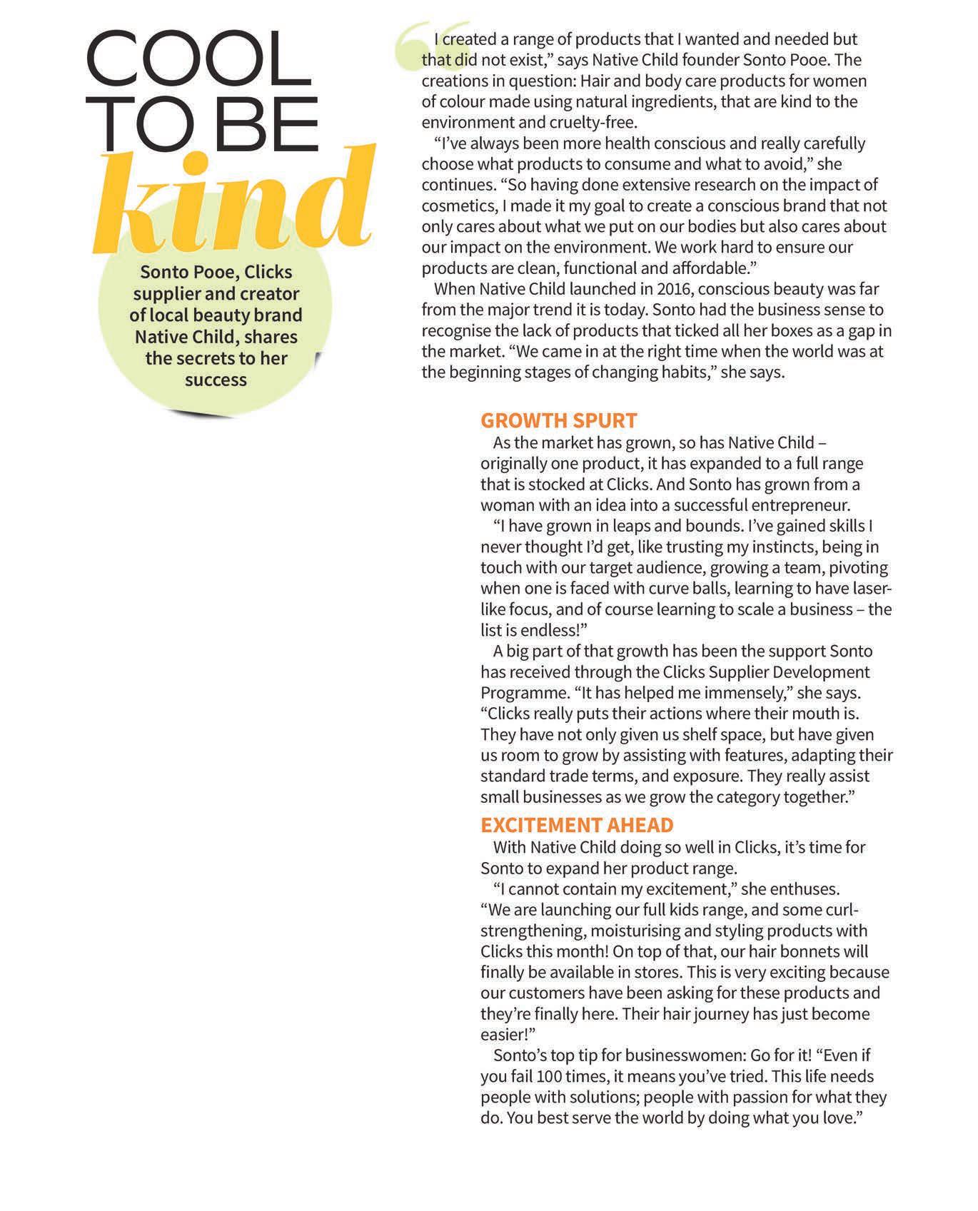 More than 40 per cent of products sold through Clicks Baby Stores are produced locally, including Clicks-branded product suppliers that manufacture its diapers, baby foods, baby toiletries and mother care accessories. Local brands, such as Oratile Kids, Afrobotanics, Portia M, Zuru, and Purity, are also available at Clicks Baby Stores.