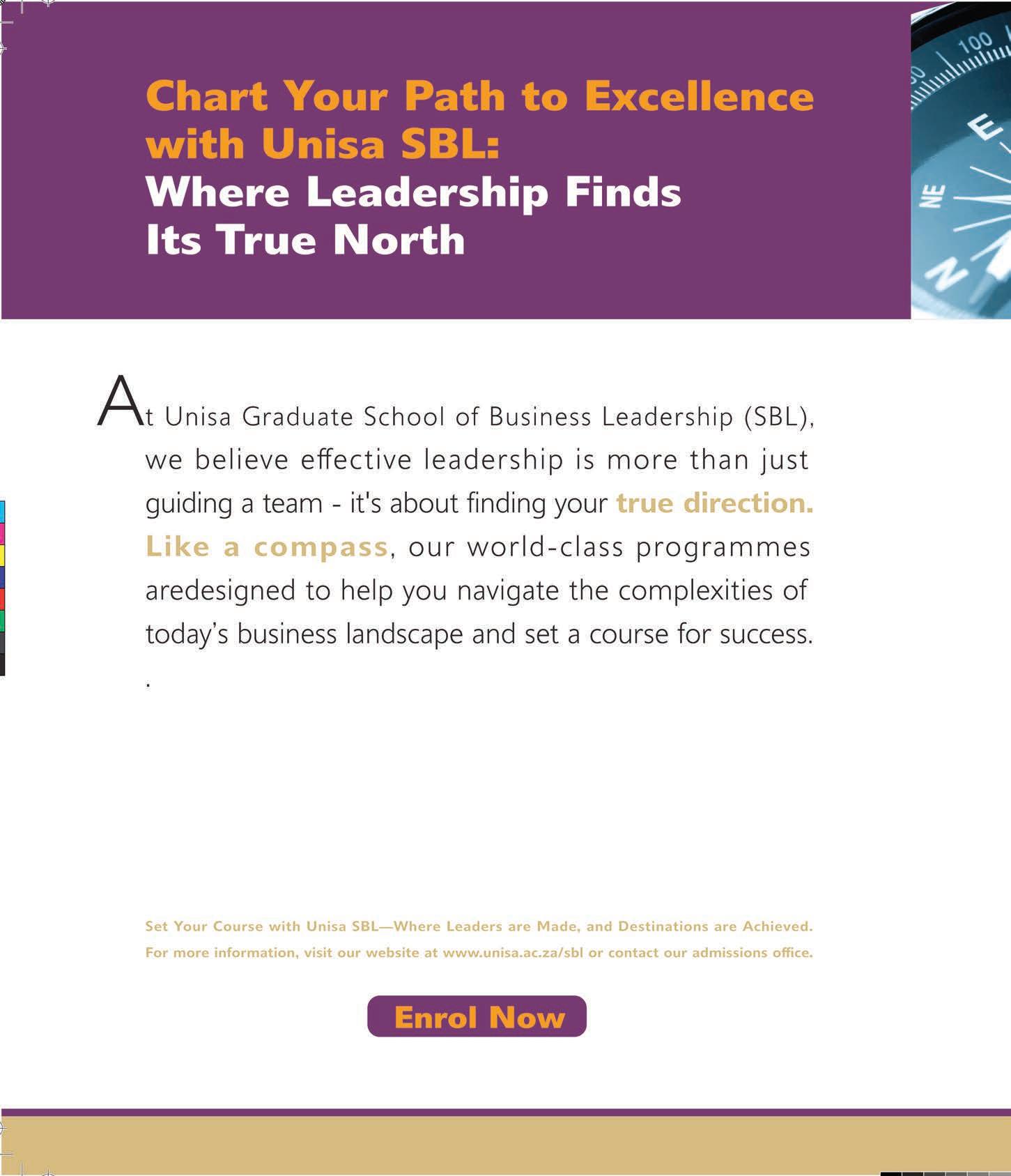 Both studies illustrate that the roles and requirements of leaders are rapidly evolving and leadership is increasingly becoming multifunctional, requiring leaders to engage their “hard and soft skills”. “It is critical that modern leaders know how to integrate hard skills, such as technical and domain-speci c knowledge, with soft skills,” says Alicia Greenwood, JSE Clear CEO and director: post-trade services.
