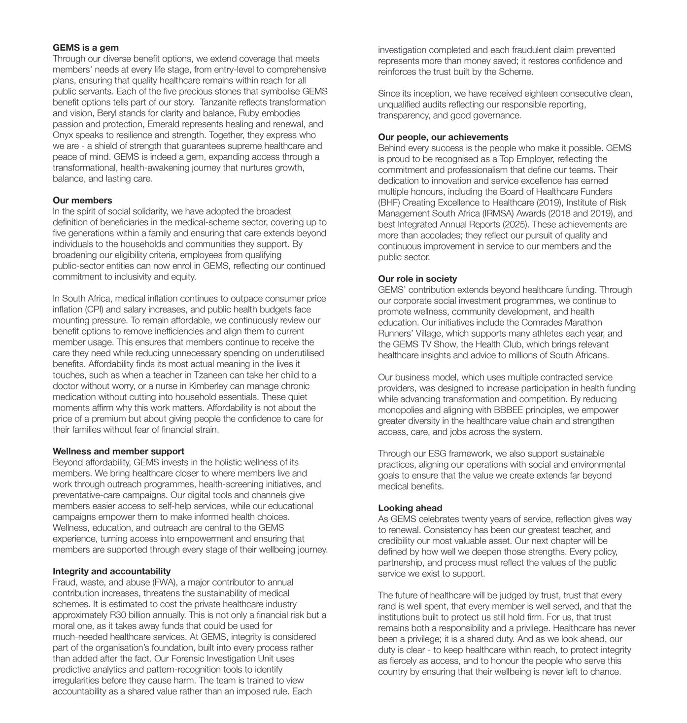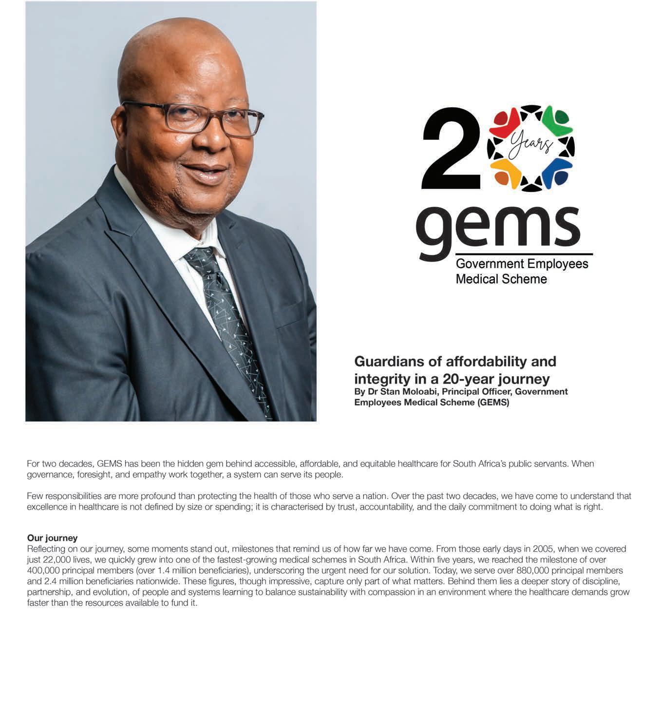 The Government Employees Medical Scheme (GEMS) is a restricted medical scheme that provides accessible, affordable, and enhanced benefits to qualifying public service employees and their nominated beneficiaries. GEMS currently provides quality healthcare to over 2.4 million beneficiaries.