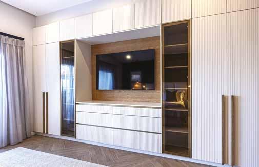 Built by Design (BBD) in Ballito manufactures and installs customcrafted cabinetry and furniture designed by OLALA Interiors. The bespoke cabinetry in this master suite is an interplay of craftsmanship and purposeful storage. Ceiling-height fluted wooden doors in a light satin finish accentuated with sleek bronze glass doors with a metallic bronze frame offer discreet storage on ample light oak shelving. An integrated plasma unit with a warm-textured oak backdrop adds depth and contrast with additional drawer storage below, resulting in a sleek sophistication of form and function.
