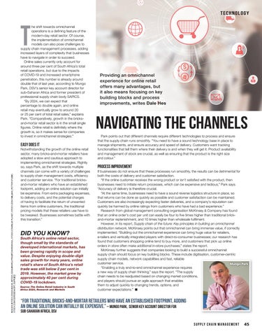 he shift towards omnichannel operations is a defining feature of the modern-day retail sector. Of course, the implementation of omnichannel models can also pose challenges to supply chain management processes, adding increased layers of complexity that businesses have to navigate in order to succeed. Online sales currently only account for around three per cent of South Africa’s total retail operations, but due to the impacts of COVID-19 and increased smartphone penetration, this number is already around double that of last year, according to Mungo Park, DSV’s senior key account director for sub-Saharan Africa and former president of professional supply chain body SAPICS. “By 2024, we can expect that percentage to double again, and online retail may eventually grow to around 20 or 25 per cent of total retail sales,” explains Park. “Comparatively, growth in the bricksand-mortar retail sector is in the small single figures. Online retail is definitely where the growth is, so it makes sense for companies to invest in omnichannel strategies.”