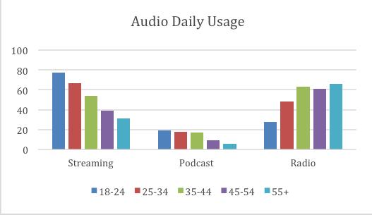 In homes with internet access, the reach through music streaming services surpasses that of radio for listeners aged 18-34. Daily podcast listening is more prevalent among that audience too, spilling over into the 35-44 age group, while older audiences are more likely to listen to traditional radio. These differences in listening behaviour will inform how to plan an optimal audio strategy.