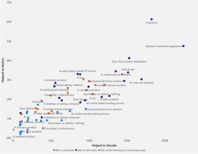 Through Audience Origin we know that noticeability and influence of audio platforms vary by category. For example, ads on radio are more influential for family and household categories such as medium household appliances and insurance brands. Ads in podcasts are more influential for categories that are more personal in nature like personal electronic devices, and online travel booking services.