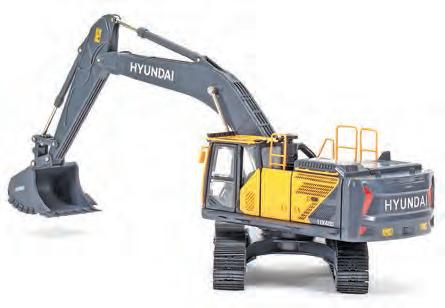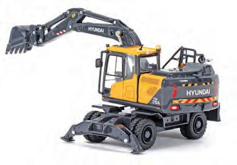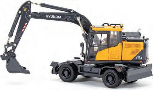roduced in the smaller 1:60 scale is the HW210A wheeled excavator, which is a stunning model. The upperstructure rotates 360 degrees and the front-end equipment has a good range of movement, although the large pin heads do stand out and would have been better touched over. The pair of outriggers can be lifted, and while the blade is fixed, there is plenty of structural detail. With metal safety railings and surface engraving of the various body panels, not forgetting the cab with its interior, this is a very impressive release and comes mounted on a plastic base.