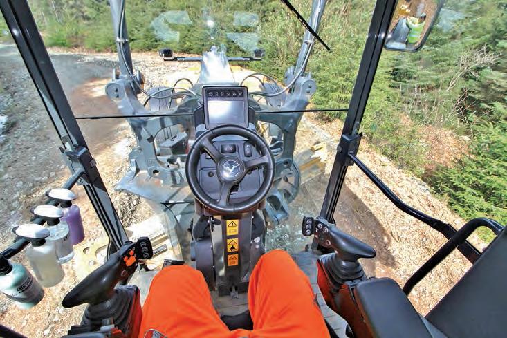 There is the usual arrangement of push-button controls and dials on the right-hand console, all of which have a quality look and feel to them. There is a start-stop button to the right of the right-hand joystick, with the added option of a digital key, which allows the cab to be opened and the engine started via a smart phone app. A light strip incorporated into front console illuminates the floor area, improving safe access into the seat during dark mornings. Talking of the floor area, a newly designed mat is fitted that makes it easy to sweep out the cab at the end of a shift.
