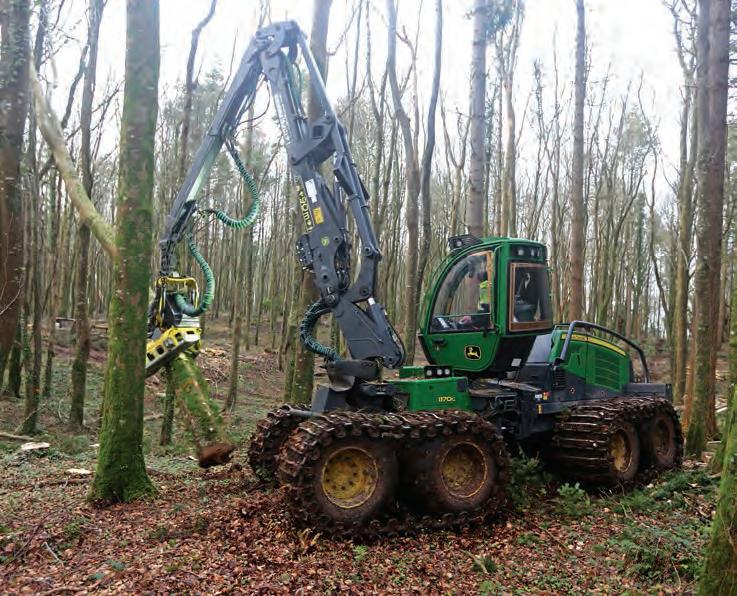 a new John Deere 810D forwarder and a JD 1070D harvester. Although this was initially a substantial outlay, it was viewed as the only way to achieve consistent work rates and avoid the costly breakdowns of used equipment. A new six-wheeled JD 1170E replaced the older harvester in 2010, and a new 810E forwarder arrived in 2015. From there, Seamus upgraded to his current machinery line-up. The eight-wheeled JD 1170G harvester had a H414 harvesting head added in 2020. Extraction continued to be carried out by the JD 810D and 810E forwarders with the former making way for the latest John Deere 910G in 2023.