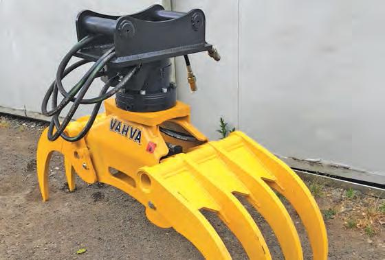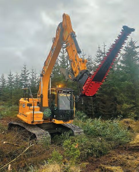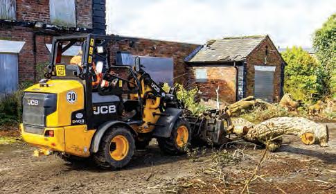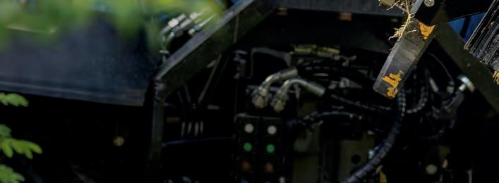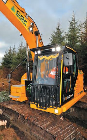 An extra auxiliary hydraulic line has been added for their rotating Powerhand saw grapple attachment, and these JCB Pro models allow Colin and his operators to set hydraulic flow and save those settings using the large LCD screen in the cab. The JCB hydraulic pump software had just been updated, resulting in flow being even more precisely set for di erent attachments. The travel motors can propel the machine at 4.3 km/h (high) or 2.5 km/h (low) speed, with a tractive e ort of 194.3kNm, which can be sustained on a grade of 70% (35 degrees) of continuous e ort.