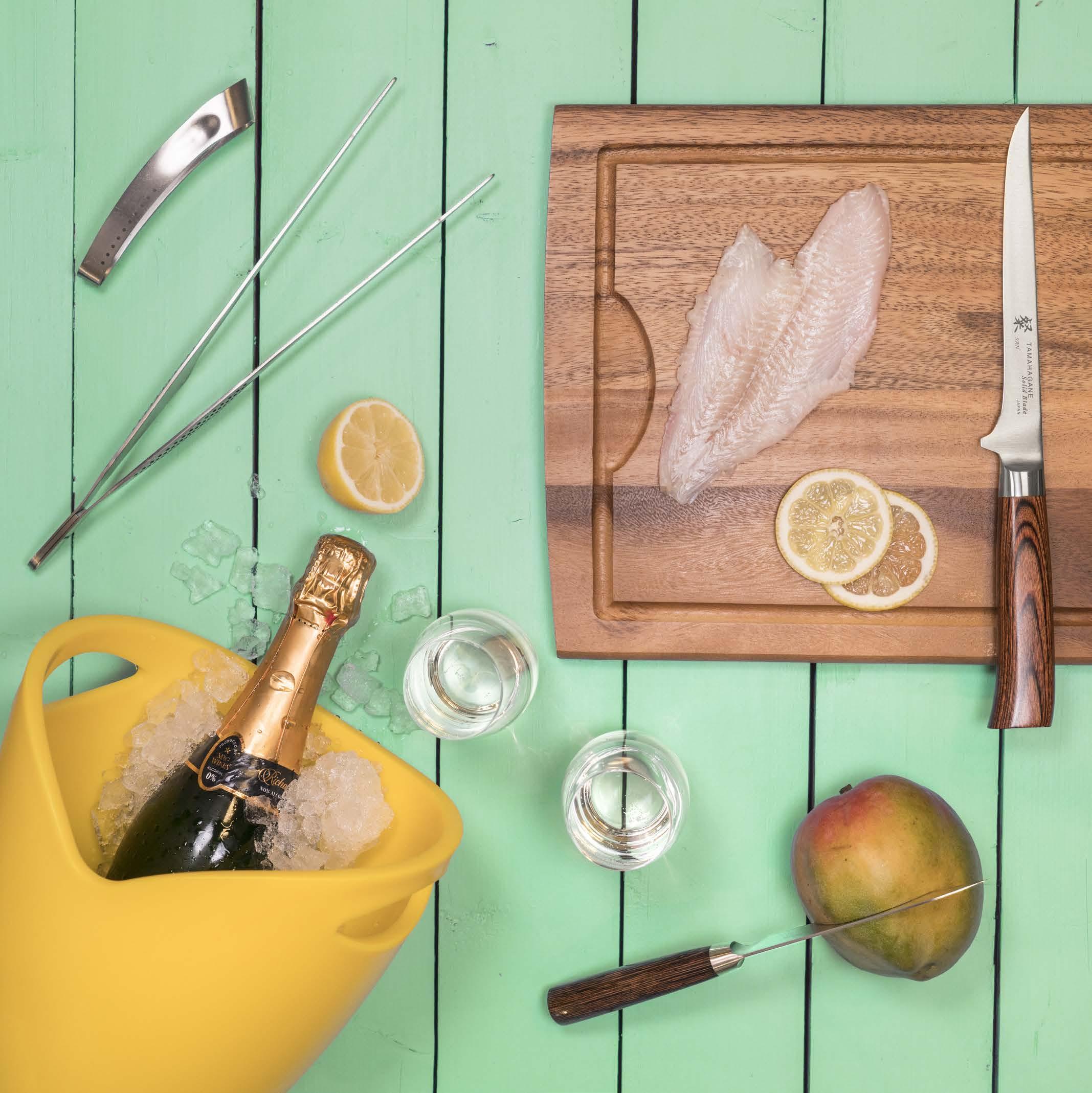 I trädgården njuter vi som bäst av sommarens smaker. Vi plockar bär, skördar potatis och grönsaker och grillen går varm nästan varje dag. Många förknippar en grillmiddag med ”kött och bea”, men det går att grilla nästan allt. Våga prova dig fram. På Sundqvist hemsida hittar du Jens Dolks recept på fisk i paket, en riktig sommarfavorit! Fisken filéar du med fördel med en flexibel filékniv och eventuella ben plockar du bort med Globals fiskbenspincett. Till frukt och grönt passar det bättre med en grönsakshacka, eller en större skalkniv om det är små råvaror som ska hackas. Oavsett vilken kniv du använder är det viktigt att du har en bra skärbräda som underlag, annars finns det risk att knivarnas egg kommer till skada. Passa på att kyla en flaska bubbel i Pulltex ishink medan fisken får gotta till sig på grillen!