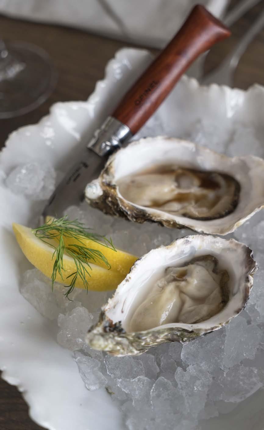 vi lämnar thomas i köket med resten av förberedelserna och slår oss istället ner till bords i salongen. Dagen till ära bjuder Skäret på en helt nykomponerad middagsmeny. Vi blir bland annat serverade pilgrimsmussla med citron, smör och tryffel, rödtunga med sås på Bohuskrabba och jordgubbar med tonkabönsglass, maränger och lime. Tången? Den har Thomas torkat och malt ner till ett fint puder. Med hjälp av en tesil garnerar han samtliga huvudrätter med en liten, liten nypa tång strax före servering.