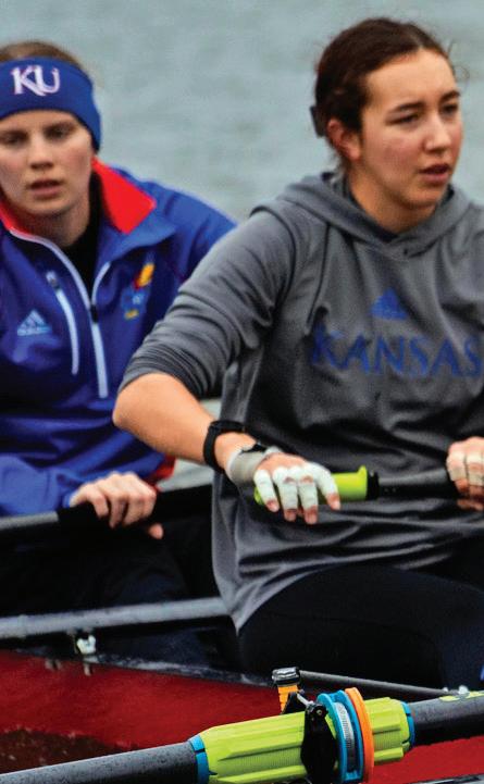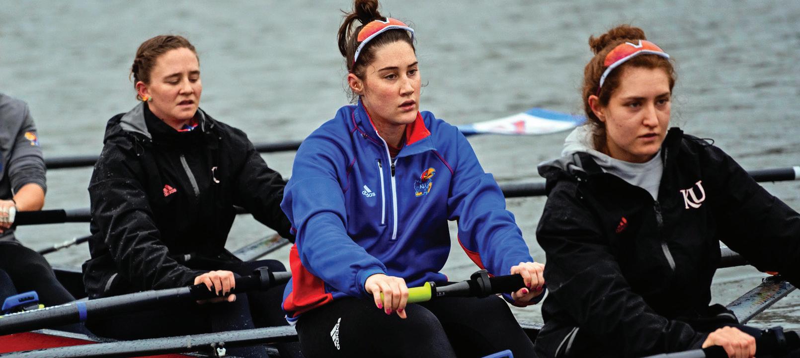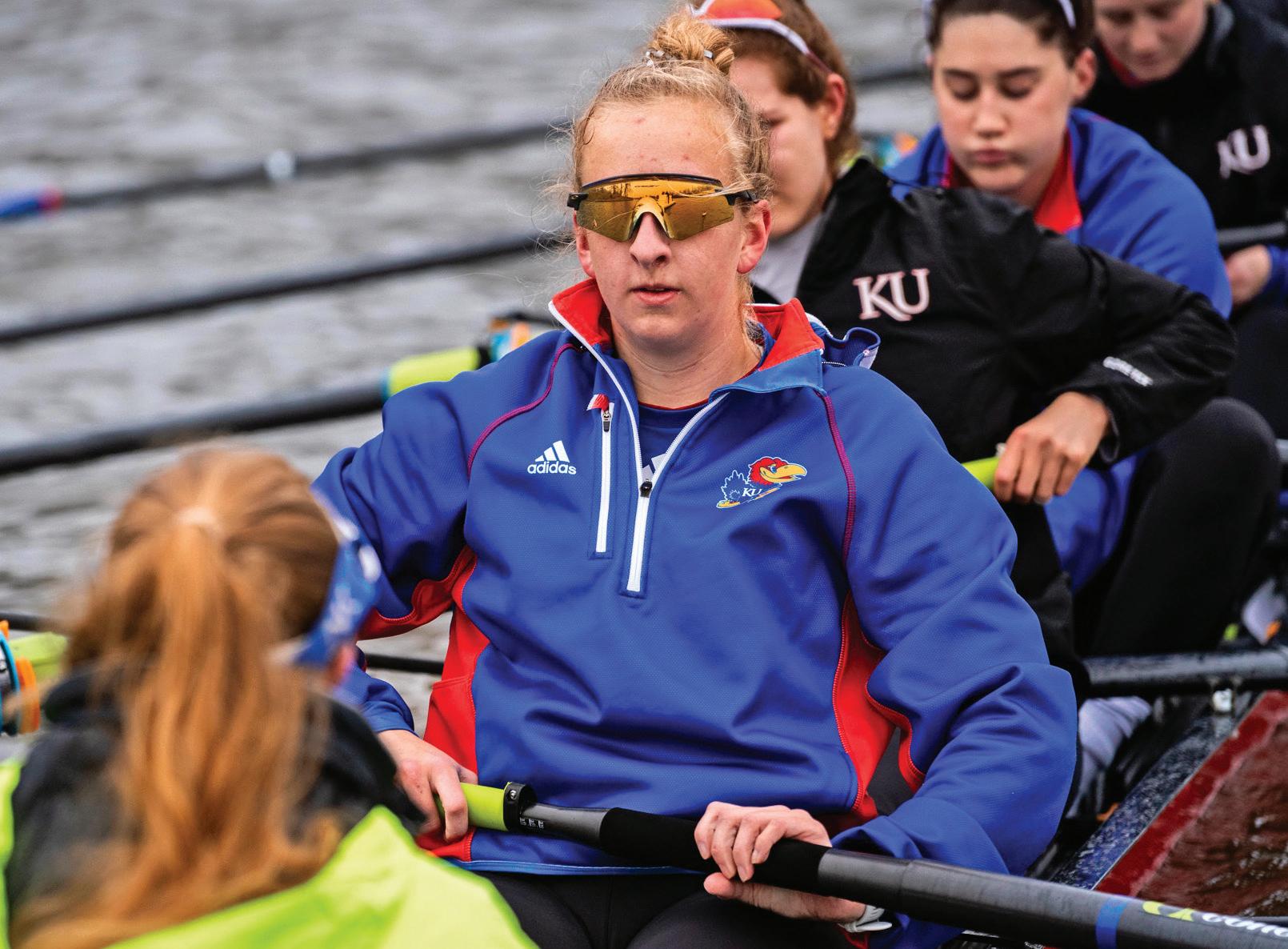 University of Kansas junior Karley Larson starts each day at 6 a.m. She grabs a banana, throws on her KU gear, and heads down to Burcham Park in North Lawrence while it’s still pitch black. There she joins 70 of her teammates to head out on the Kansas River in large boats to row, rain or shine, training to be the best they can be.