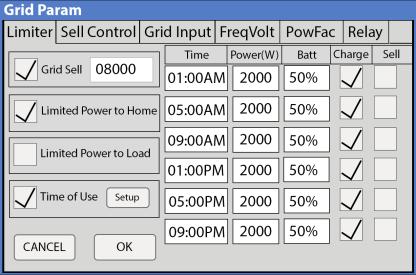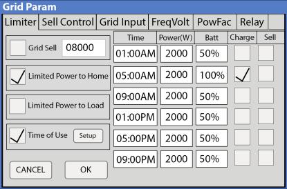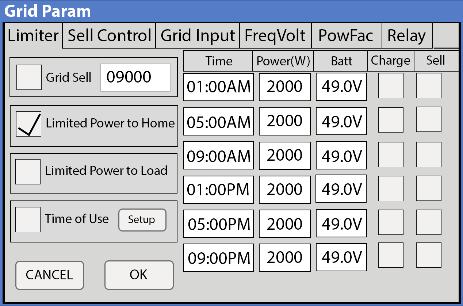 3. Make sure the “Grid Sell”, “Limited Power to Home”, and “Time of Use” boxes are checked in Limiter menu. Set the number next to “Grid Sell” to between 0 - 12000W, this is the maximum amount of Power that can be sold to grid from PV production. (Fig. 3).