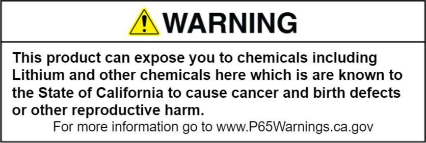 WARNING: This product can expose you to chemicals, including lithium compounds, which are known to cause cancer, birth defects, or other reproductive harm. For more information, visit www.P65Warnings.ca.gov Please note that you cannot be exposed to these chemicals without opening the external casing. Only members of the SunFusion Service team and other SunFusion-certified technicians should openthe outer case. (California installations specifically).