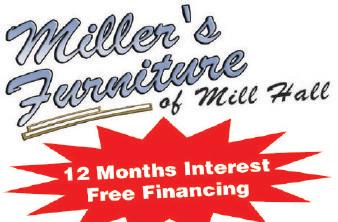Miller’s Furniture, 3064 Eagle Valley Road, Mill Hall, has all your home furnishing needs. Stop in to see for yourself, from 9:30 a.m. to 1 p.m. and 2 to 5 p.m. Monday through Thursday, 9:30 a.m. to 1 p.m. and 2 to 7 p.m. on Fridays, and 10 a.m. to 3 p.m. on Saturdays.