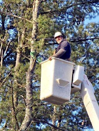 At left, a manicured lawn is seen following a tree removal and cleanup. Below, Mike Saar is seen in a bucket while trimming or removing a pine tree.
