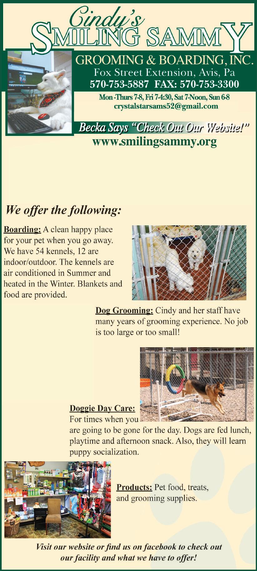 Cindy’s Smiling Sammy Grooming & Boarding in Avis offers their customers appointments for pet grooming and personalized service. They are highly rated by their customers in online reviews.