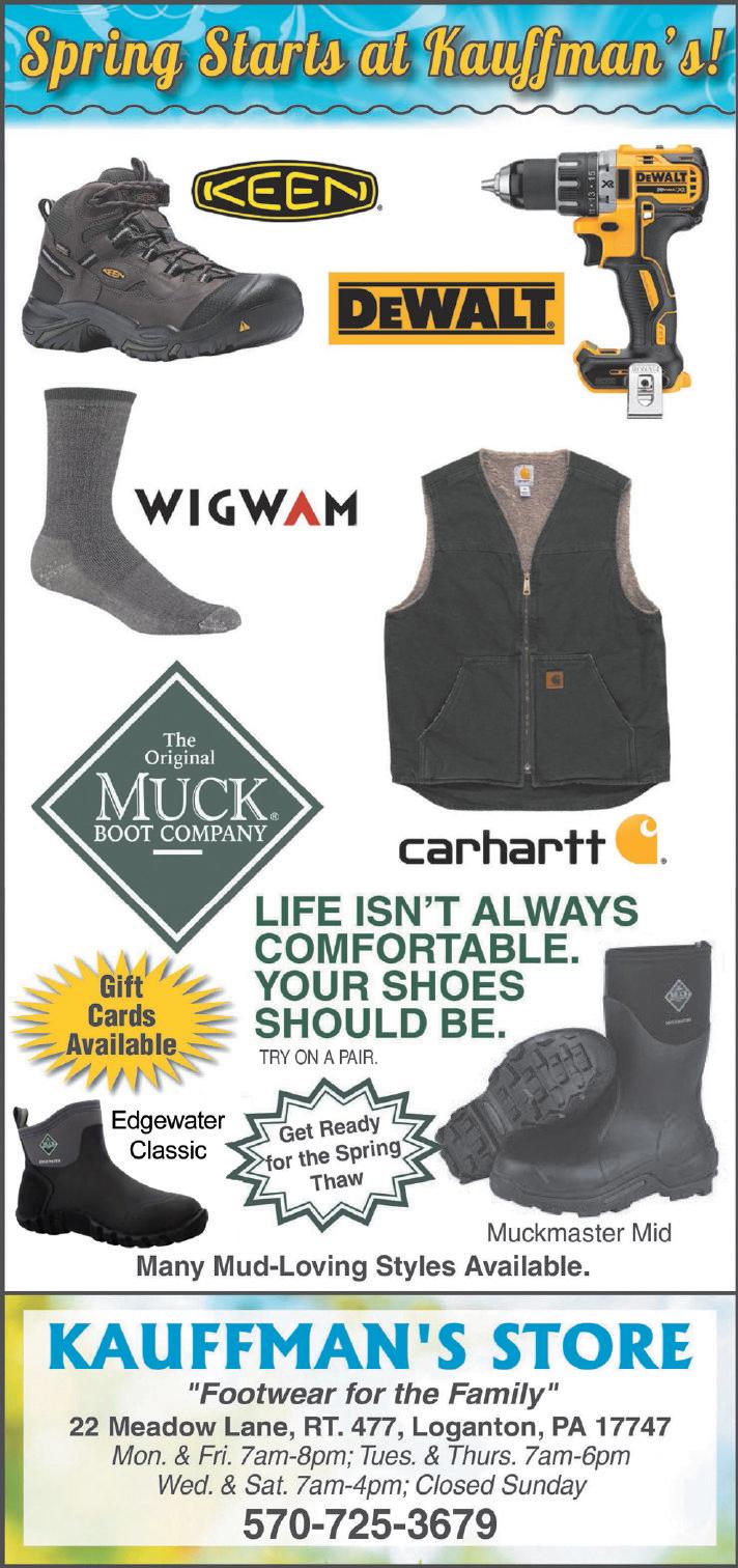PHOTO PROVIDED Kauffman’s Store, 22 Meadow Lane, Loganton, offers a wide range of goods, including durable shoes. Visit from 7 a.m. to 8 p.m. Mondays and Fridays; 7 a.m. to 6 p.m. Tuesdays and Thursdays; or 7 a.m. to 4 p.m. Wednesdays and Saturdays.