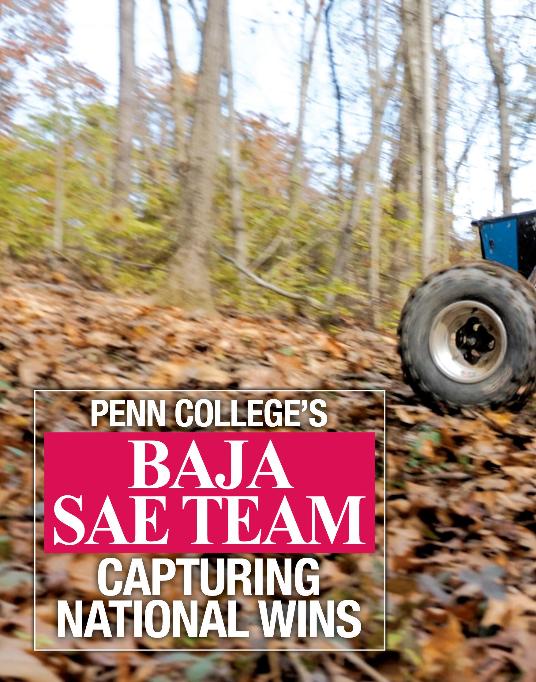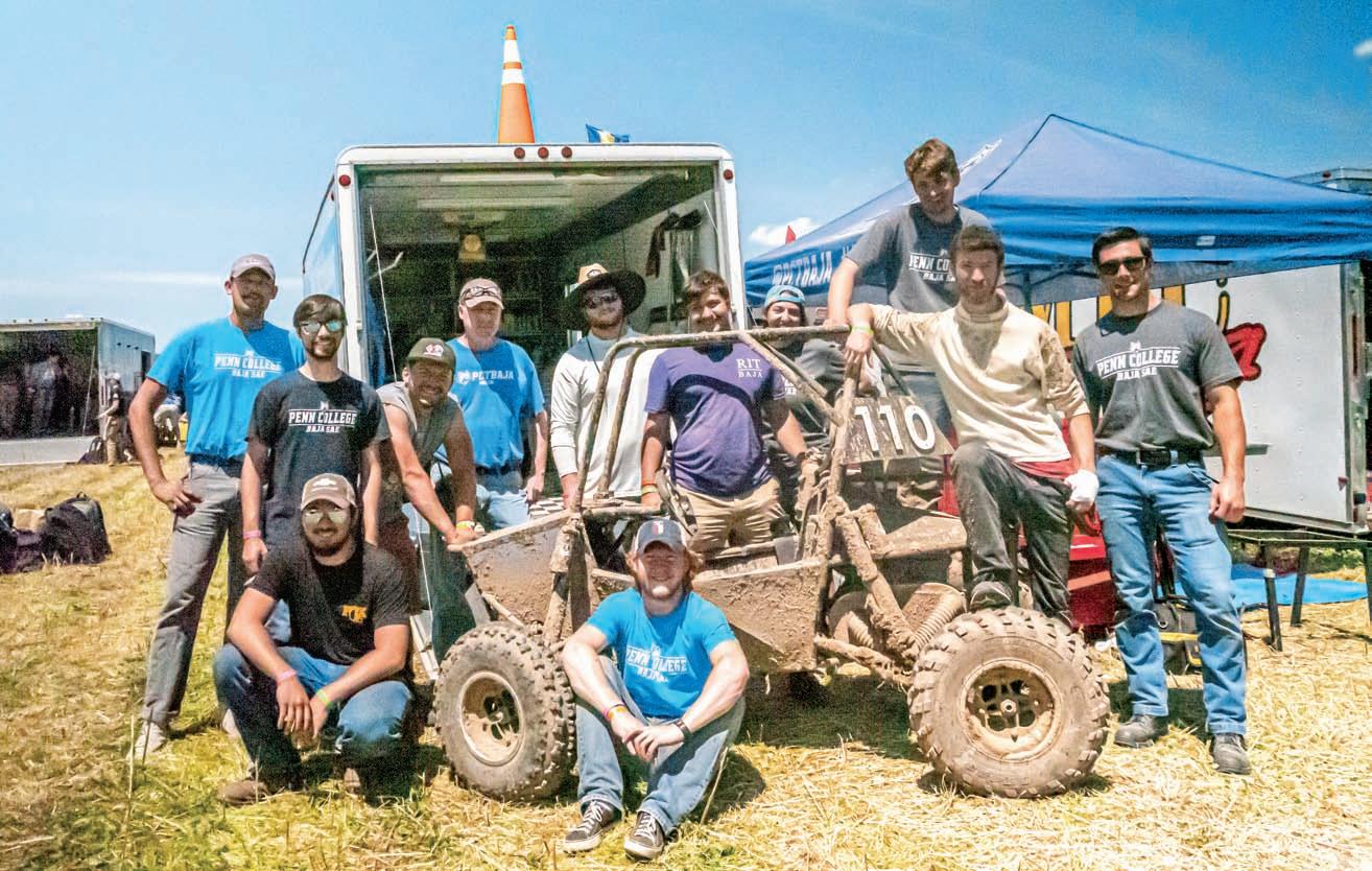 Don’tcallitabuggyanddefinitelydon’tcallitago-kart. ThevehiclesusedinBajaSAEracingarebestdescribed ascustombuiltATV’s.TheBajaSAE(SocietyofAutomotiveEngineers)racingteamatPennsylvaniaCollege ofTechnologyhasbeencompetinginthesportforalmosttwentyyearsandtheyareinthemidstofawinningstreak. SowhatexactlyisBajaSAE?“Itisacollegeengineeringcompetitionwherestudentsaretaskedtobuildaoneperson,off-roadvehicledesignedtogooverobstacles,”saysJohnG.Upcraft,advisorto PennCollege’sBajaSAEteamandalsoamanufacturingandmachininginstructoratthecollege.“BajaissaferthananATV.IthandlesalittledifferentlyandIlikeourengineeringbetterthanthe off-marketATVs,”saysMarshallFowler,whoistheteamleaderof PennCollege’sBajateam.