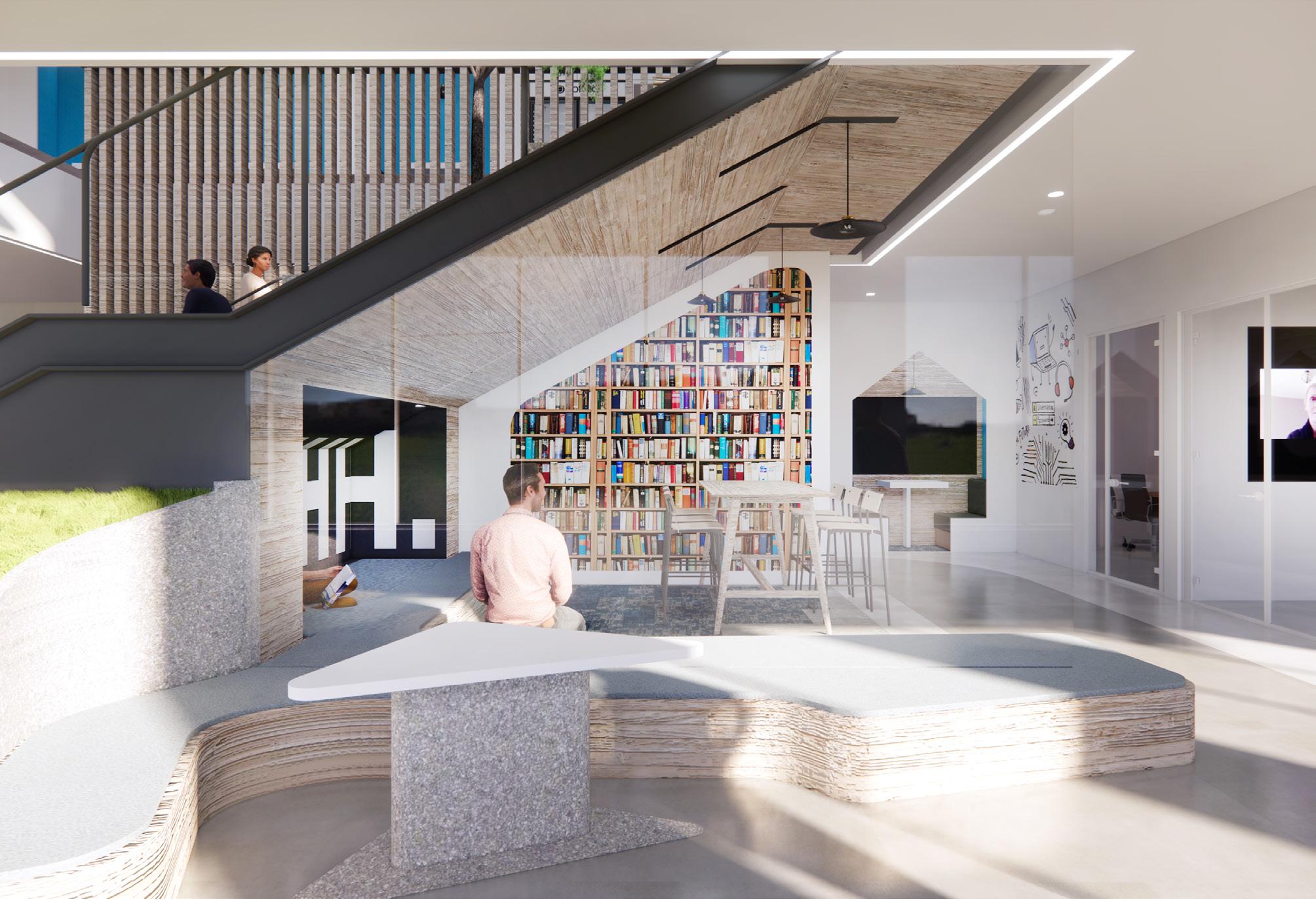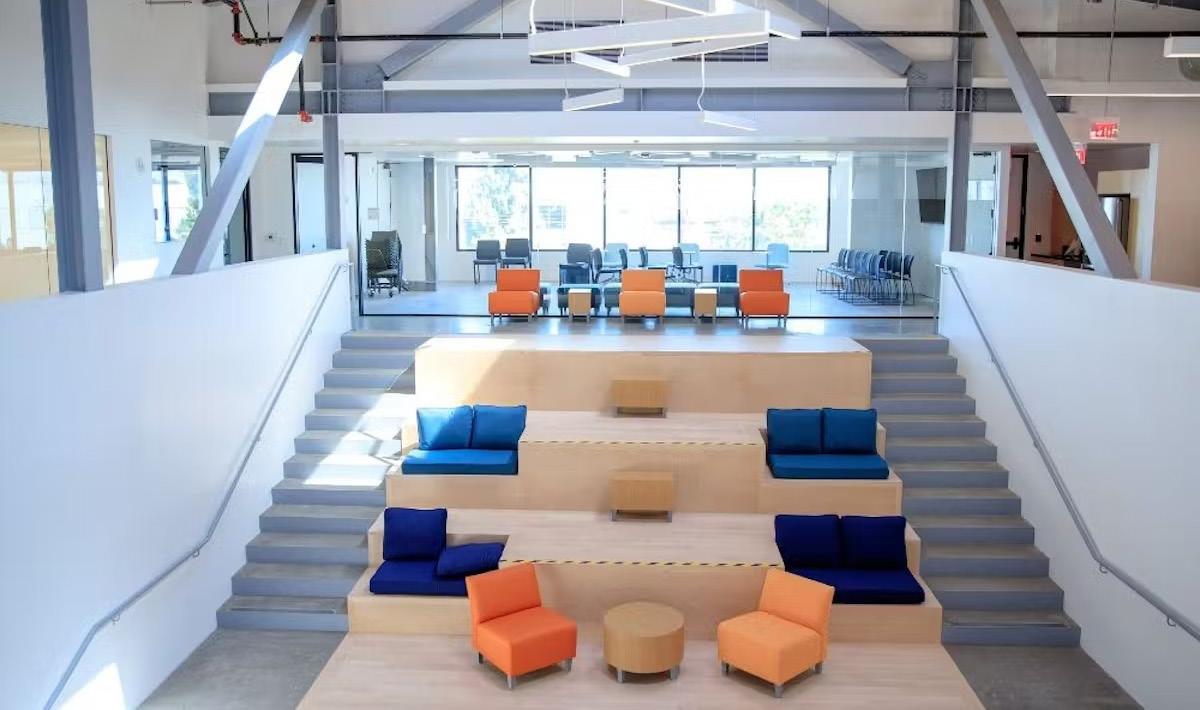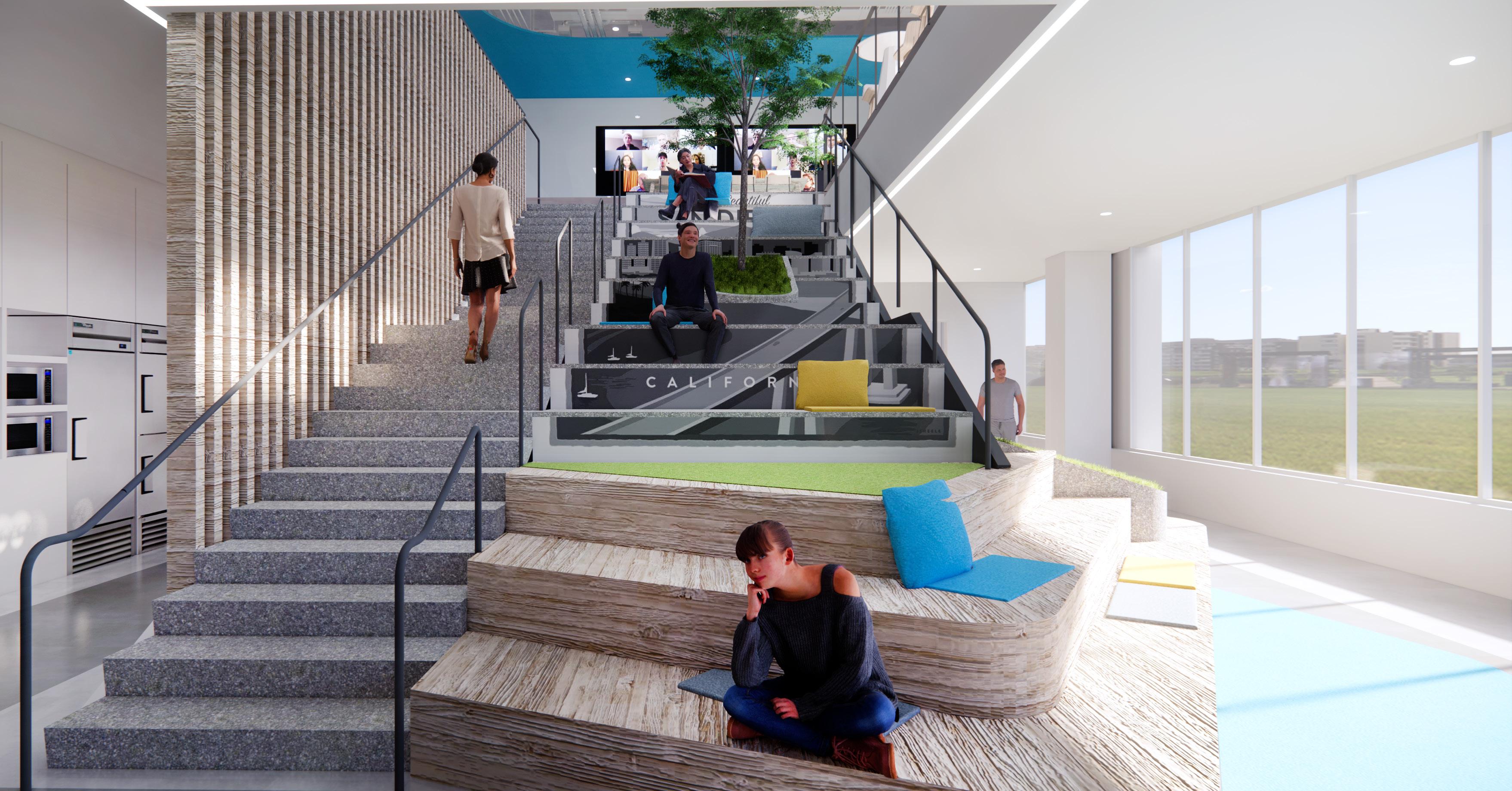 Appfolio embraces creativity and wasn't afraid to use pops of color, which gave us the opportunity to create focal points throughout the spaces, drawing inspiration from their brand colors. We carefully balanced the vibrant elements with more subdued and calming themes in the other locations, allowing the focal areas to stand out even more. The San Diego office features a sophisticated lobby that guides visitors through a clear sequence of arrival. Additionally, an interconnecting staircase doubles as a library space below and provides functional access to different levels. The staircase's stepped seating makes it versatile for all-hands meetings and g atherings.