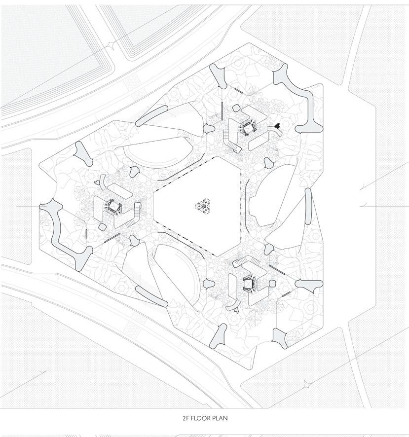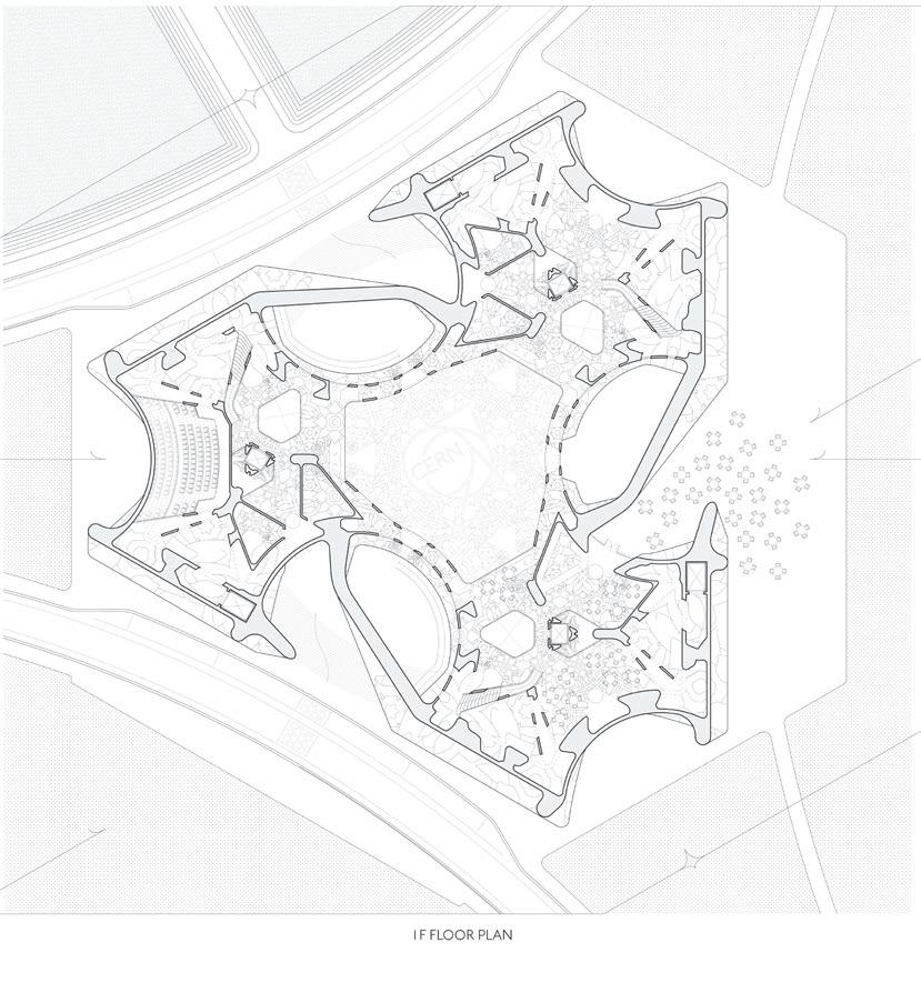 The pattern generates a multiplicity of axis and hierarchy globally and locally as well as connections and adjacencies. The pattern is an organizational strategy, The mechanism and interface between scalar orders of magnitude from the campus within the landscape to the ornamentation of the architecture. The pattern allows the potential of growth internally and externally. The agglomeration of the pattern permits a dynamic multiplicity of potential relationships, instead of static singularity. It is neither the platonic notion of ideal form nor is it formal optimization that responds to a specific contextual problem set. The idea of pattern and ensemble is reflected to the physical planning and programming of the new CERN campus.