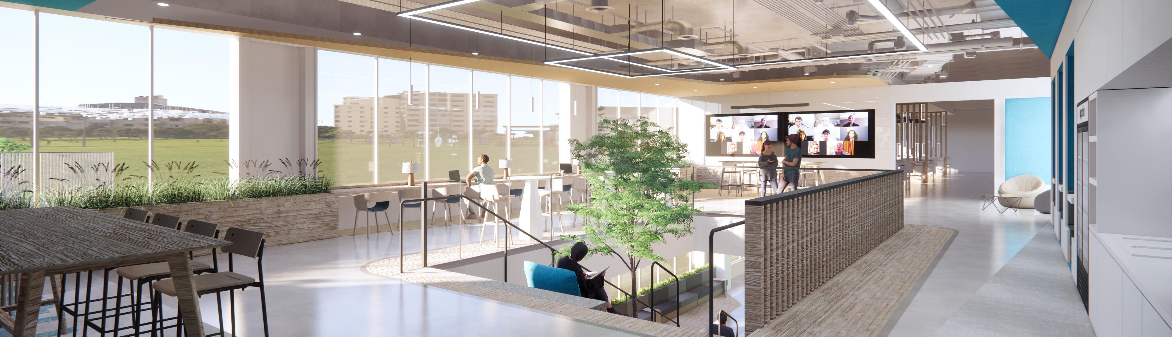 The project is large adaptive re-use of two 18,000SF warehouses sandwiching a two-story atrium addition featuring two adult olive trees, a sculptural entry stair, and a double-height terraced seating area. the combination of the existing building and new construction forms over 60,000SF of open and private offices, lounges, photo studio, executive boardroom, prototyping lab, cafe and a 2,000SF commercial kitchen for employees.