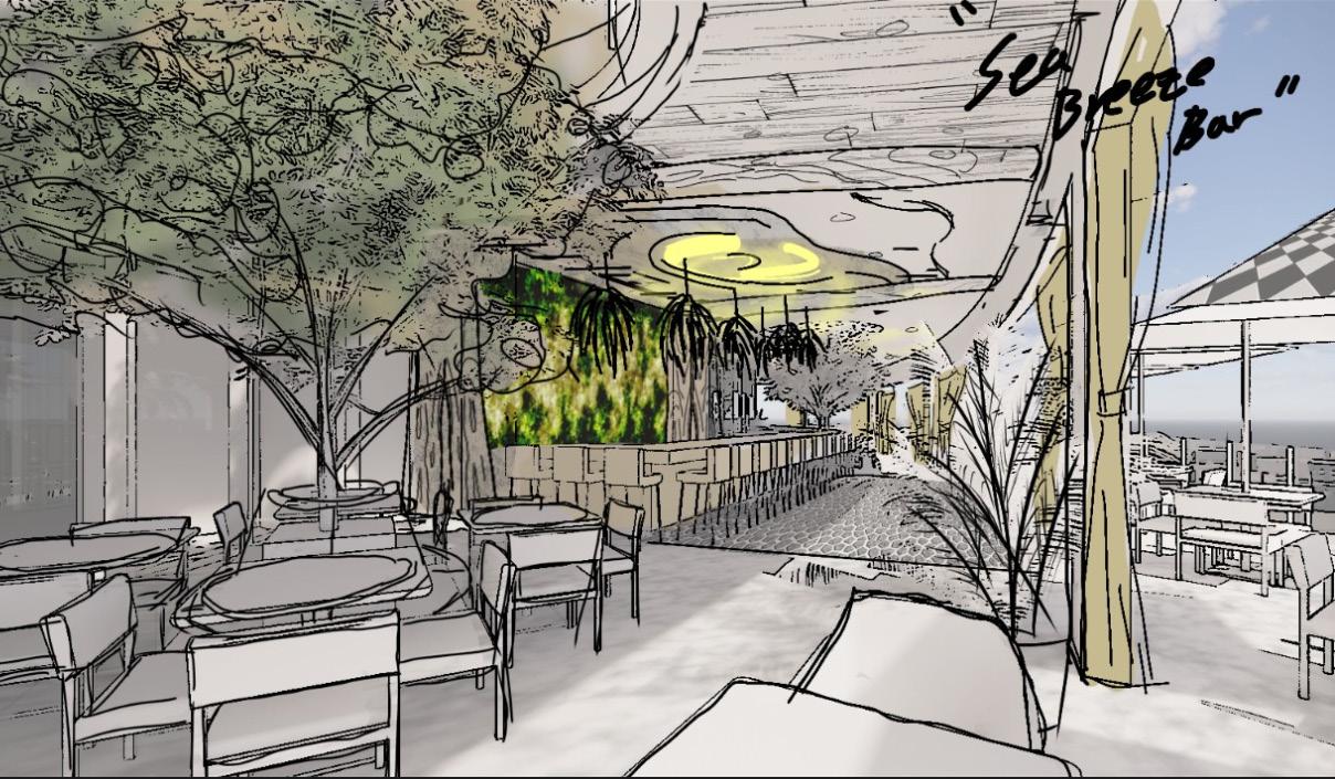 To add a touch of uniqueness, we designed a monumental spiral staircase, inspired by the resort's sister locations. This captivating feature offers guests an enchanting view of the coastline, setting it apart from other hotel properties. The brothers' passion for sports led to the creation of a spectacular sports bar. We incorporated a Las Vegas-inspired panoramic display system that immerses guests in an exhilarating viewing experience. This addition was met with great enthusiasm, enhancing the resort's offerings for sports enthusiasts. For the Sea Breeze Bar, located on the outdoor patio, we embraced the blend of indoor and outdoor elements. Drawing inspiration from coral reefs, we crafted a lighter and more sunlit atmosphere, capturing the interplay of sunlight and shadows as an additional layer of design. Overlooking the pool deck, the Beach Comber Lounge required both sun protection and a visual connection to the sport bar through the monumental staircase. We designed a canopy inspired by the sport bar's aesthetic, harmonizing the sheltered oasis with the surrounding ocean. Its geometric form creates a seamless connection to the beach, evoking a serene coastal ambiance.