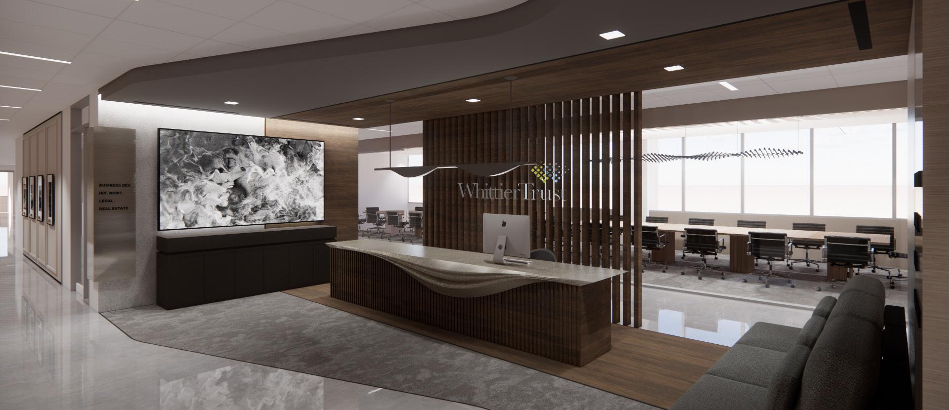 The welcoming lobby sets the tone for the entire workspace, exuding intimacy and sophistication. Designed to reinforce Whittier Trust's image as a trustworthy wealth management company, the lobby is surrounded by discreetly placed conference rooms, offering privacy and functionality for important meetings.