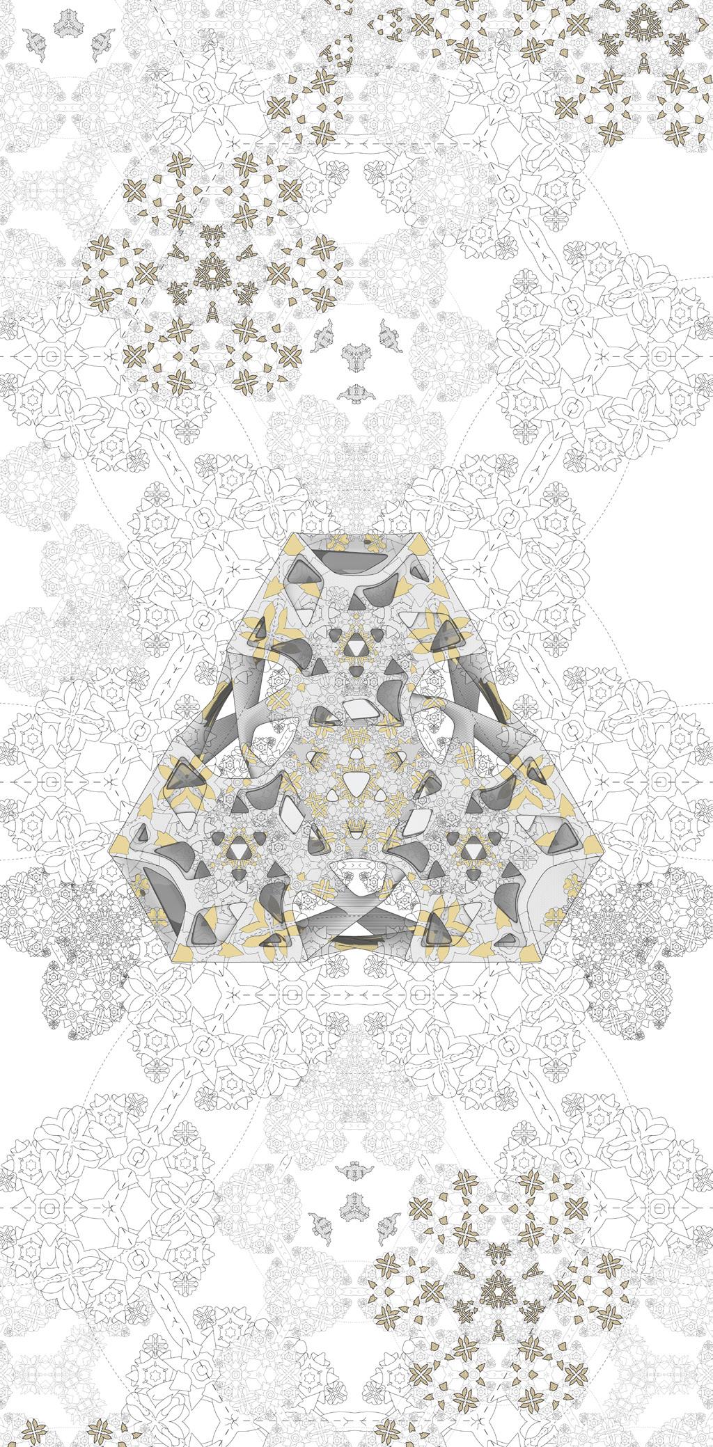 The pattern not only acts as a form-generator, but also acts as an interface of conversion between 2D pattern and 3D materiality. It is projected to the building mass and dictate te material division and scaling architectural details.