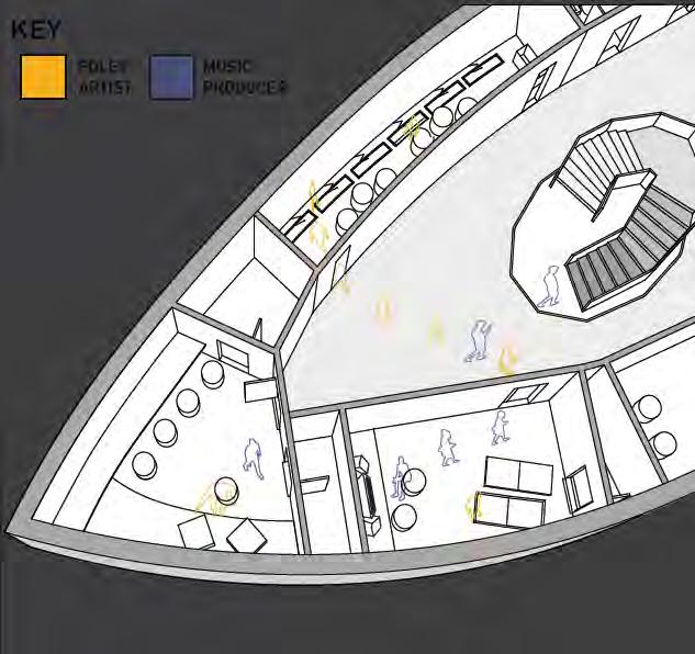 To achieve this, the building features unique studios that offer varied experiences in sound diffusion, echo, and projection. Vein-like pathways connect these spaces to nearby communal areas and music venues, encouraging interaction with the local scene. At the same time, secluded individual sleeping units provide residents with personal spaces to recharge. These private areas are linked by a communal living space designed to spark interaction, excitement, and creativity, making the residency a truly immersive and inspiring experience