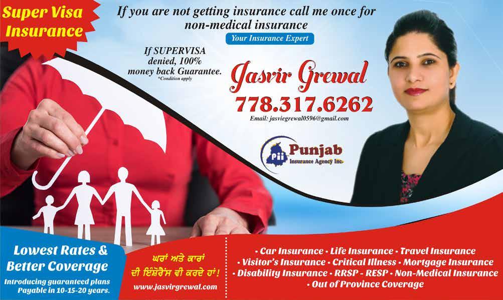 As an independent Insurance Advisor working through Punjab Insurance Agency, I deal with different insurance companies offering plans for different types of insur ance. I can explain to you in detail the insurance plan options and coverage that are suitable for your needs and resources. Besides, I can also help you to purchase Mortgage Insurance, Super Visa Insurance, Disability Insurance, Critical Illness Insurance, Extended Medical Plans, Group Medical Plans, RESP, RRSP, Travel Insur ance, TFSA accounts, Health & Dental plans along with Estate Planning suitable for your needs and resources.