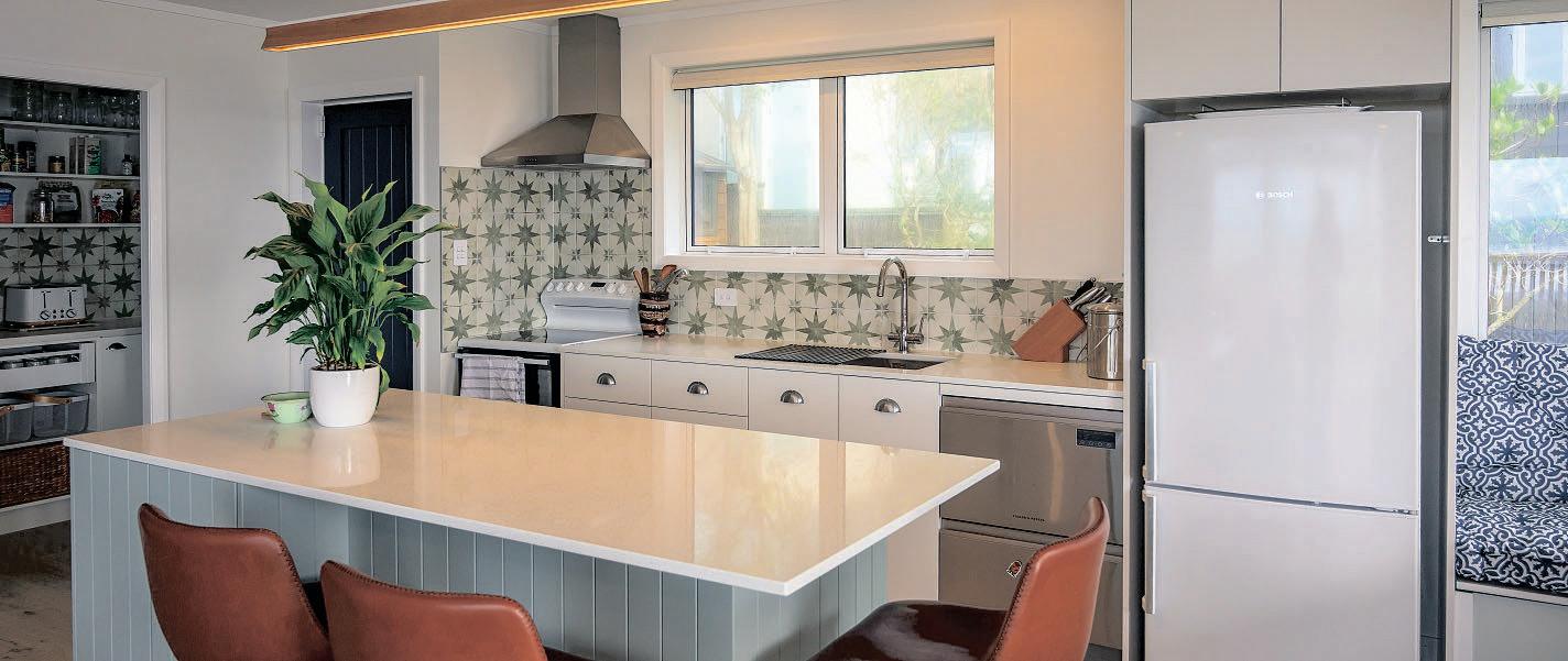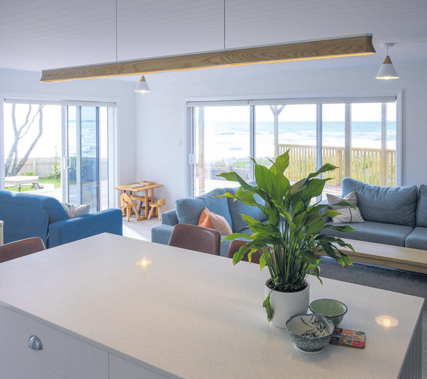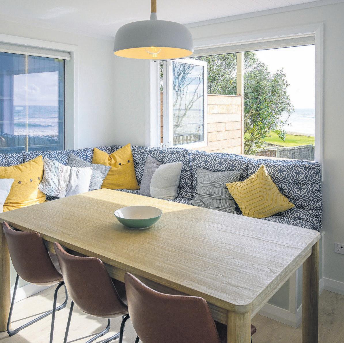 and removed the wall between the lounge and kitchen. They installed insulation and huge doubleglazed tinted windows and ranch sliders that not only made the most of the absolute beachfront views but also retained privacy and made the cottage snug for winter stays.