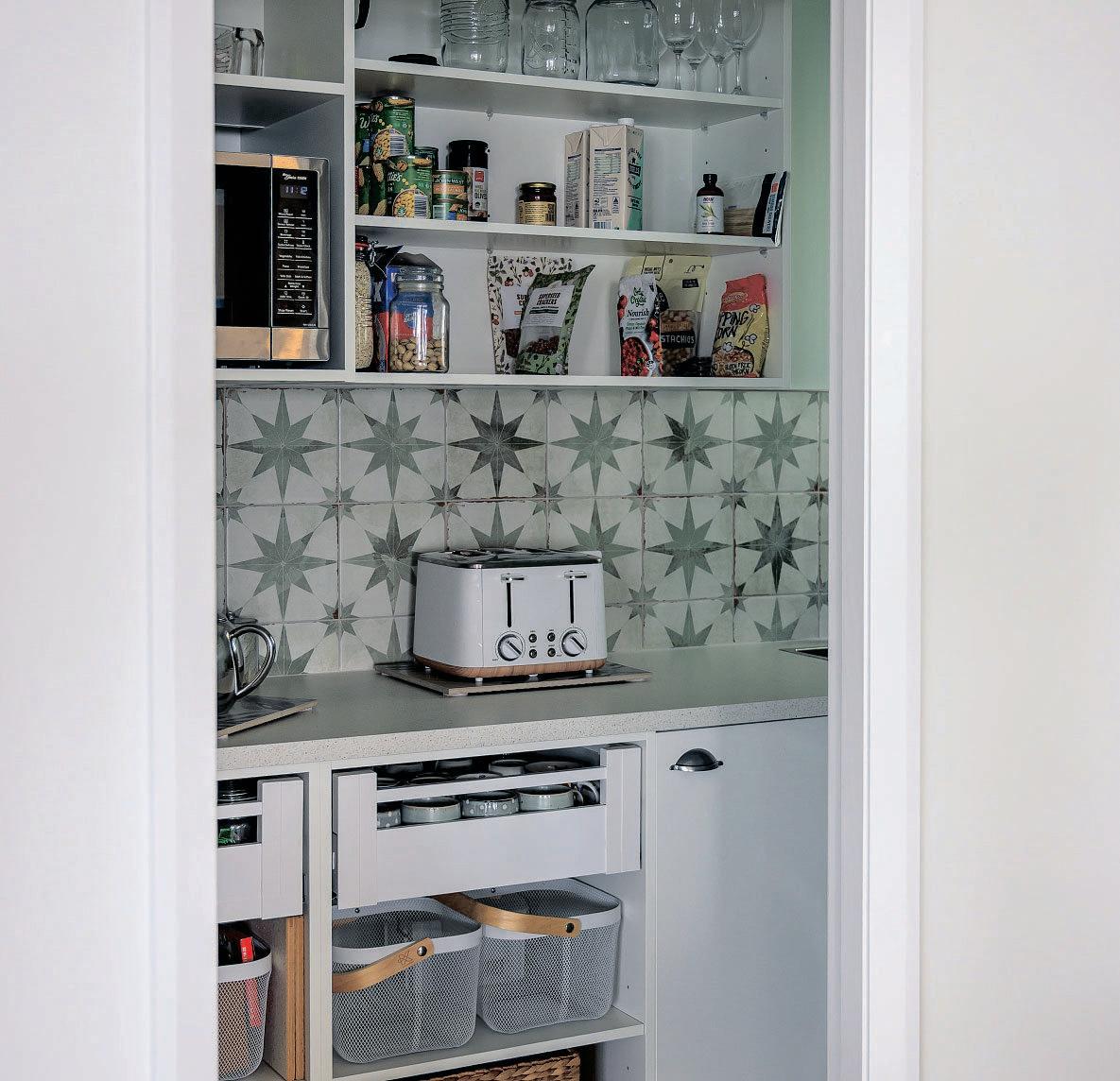 As in any small dwelling, space is at a premium, so Laurie asked that shelves be added to the laundry to create a walk-in butler’s pantry next to the washerdryer