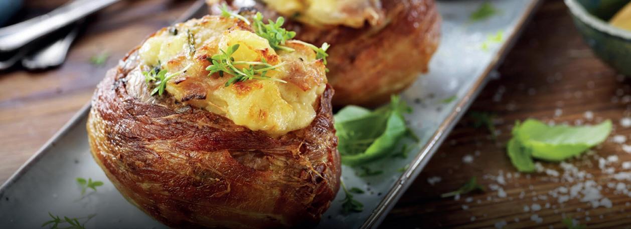 • Helstekt kotlettrad med ädelostsås, potatis och blandade grönsaker