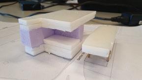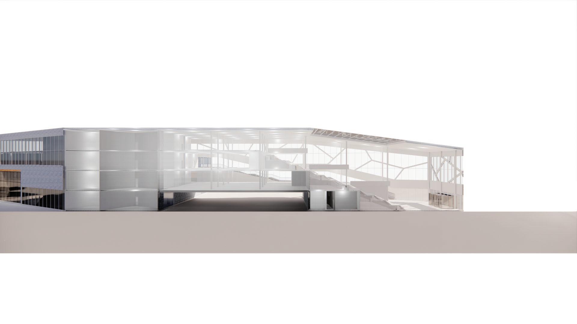 opposite the railway. First, the ground level of the mass is dug in the direction of the train road and the roadway. Then, the volume is pushed in, based on the cutting line generated in the first process, and the volume is rotated parallel to the angle of the existing building. The new compressor room of the existing building is deleted and reconnected with a new material rather than a brick. Finally, the edge and roof of the mass are carved and the rear part is sharply extended like the shape of an ice block.