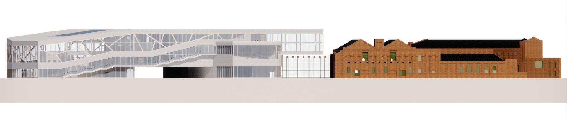 ation at the same time, the possibility is created to give the buildings a more diverse spatial experience by allowing the past and the present to coexist. A new volume is added to the building, designed to act as a physical bridge between The Grimsby Ice Factory and Grimsby Town, in the form of a grand stair inside, as well as outdoor stairs for both the existing and extended buildings.