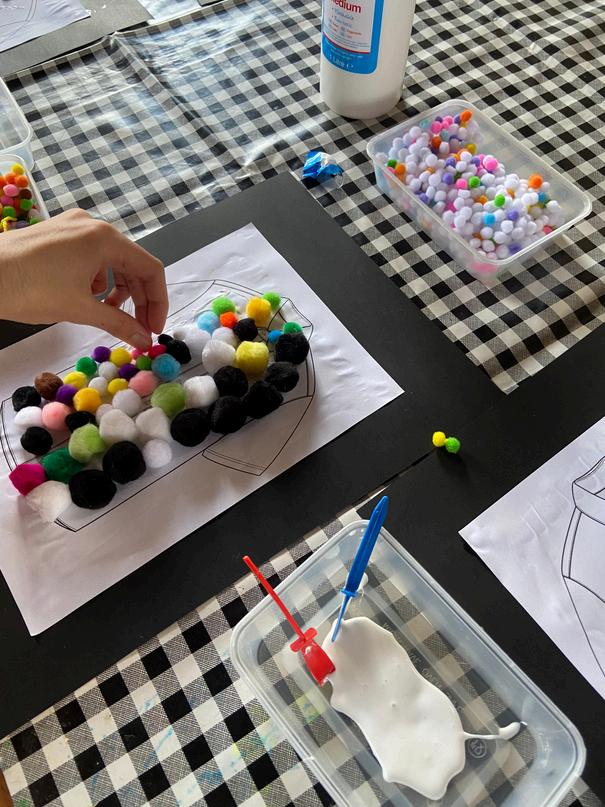 Isetupandcoverthetablessotheydonâtgetmessy.Igetthestuff out like the glue, paint, puzzles and the games. I sometimes help maketeasandcoffees.