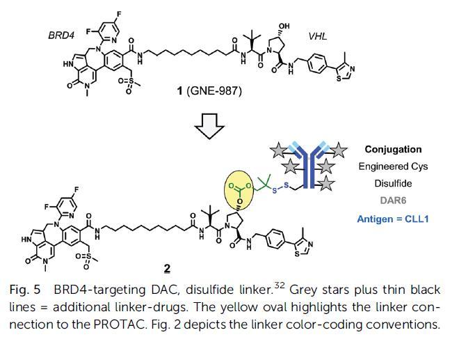 OneofthefirstDACspublishedinapeerreviewedscientificjournalisapotentDAC (GNE-987)thatusesacleavablelinkercontainingadisulfidebondtolinka BRD4-targeteddegradertoaCLL1-targetedmonoclonalantibody.Itconjugates6 degradantmolecules(DAR=6)on1monoclonalantibodybyaddingcysteinetothe specificpositionoftheantibody