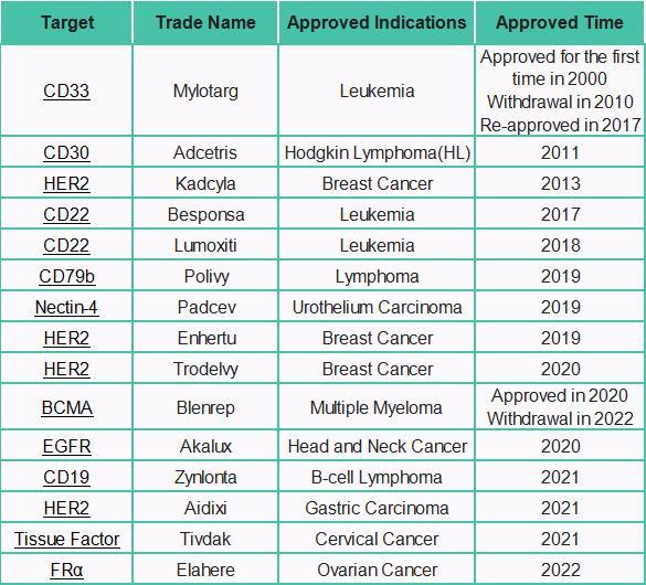 15marketedADCdrugscorrespondto11targets,whichareCD33,CD30,HER2,CD22, CD79b,Nectin-4,BCMA,EGFR,CD19,TissueFactorandFRα.