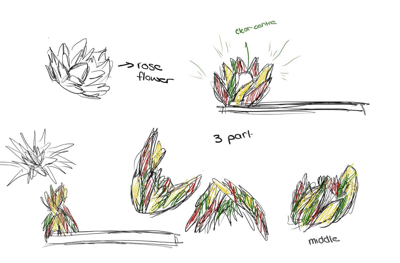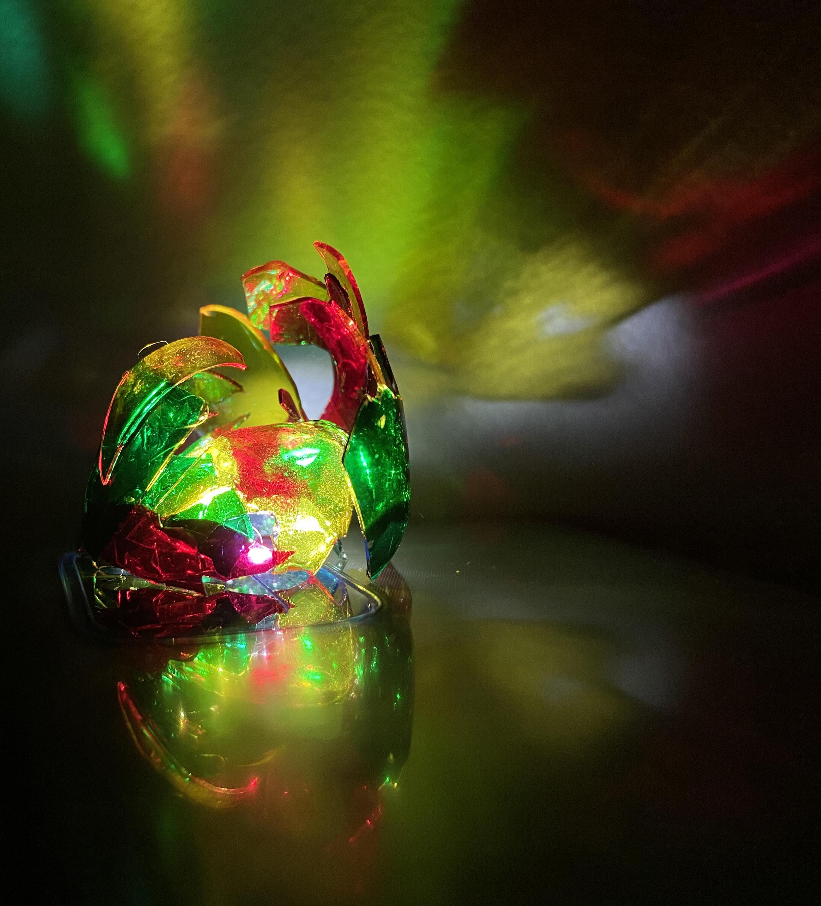 The base is circular, while the middle and top sections resemble petals, creating an organic shape. When the lamp is turned on, the yellow, green, and red lights overlap, casting dynamic, colorful shadows that shift and interact, adding to its mesmerizing effect.