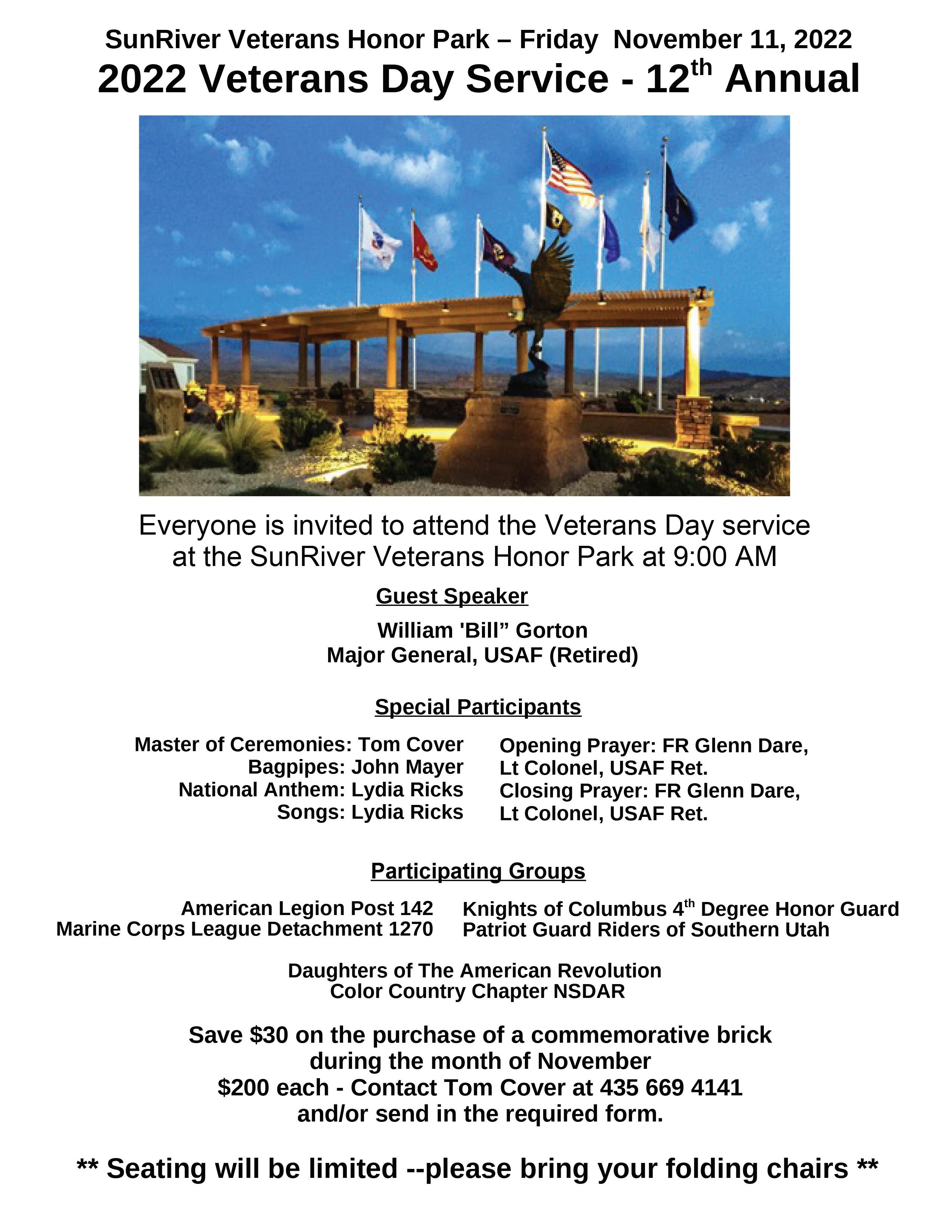 The idea for The Veterans Honor Park began in 2009 with one individual, Gordon Rogers. ‘Gordo’ was a proud Marine who felt that SunRiver was a community worthy of a dedicated place to honor all who have or will serve our wonderful country. He took his vision to Darcy Stewart, who gave the approval to use the park for this worthy cause. Gordon then secured the support of CJ Iacona and the American Legion as a method of accepting tax-deductible donations from the Residents. After speaking to the architect regarding possible designs and donations for the building of the park began in 2010. By late 2010, with the generosity of the SunRiver Residents, enough money had been raised to erect a simple monument with a single flagpole. With the determination of one individual, Gordon Rogers, a vision that many thought was not possible in SunRiver would become a reality. Thus began the journey for Gordon and Gene Rogers here in SunRiver.